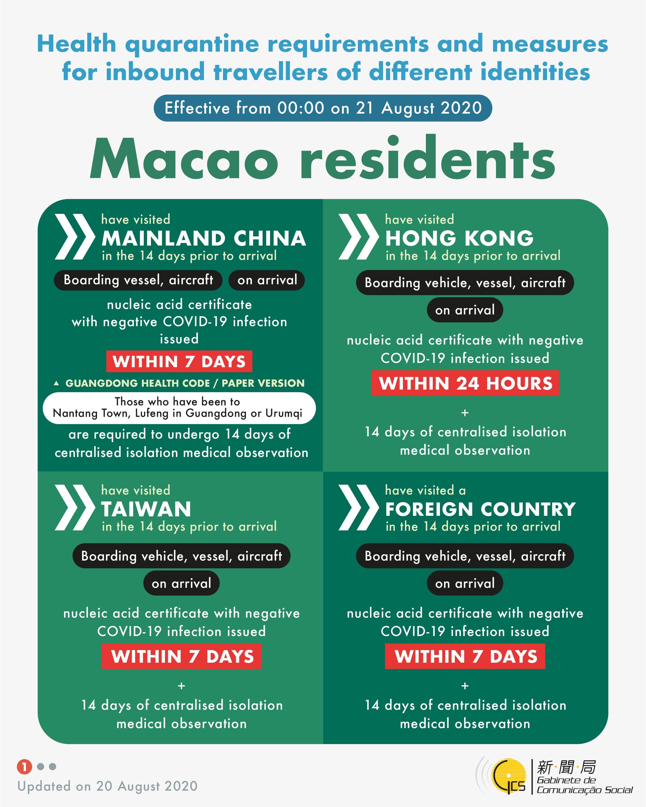 Health quarantine requirements and measures for inbound travellers of different identities, updated on 20 August 2020.