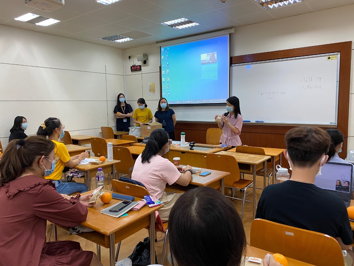 The activity was led by Louisa Lam, the Registrar of Pedagogic Affairs Department, Antonio Chu, the Head of Student Affairs Division and Cassenna Chan, the Acting Head of Admission and Registration Division. By interacting with the students in the classes, they shared health information and distributed healthy fruits and refreshing drinks. IFTM hoped to remind the students to have good personal hygiene, to maintain a balanced diet and to do regular exercises. Simultaneously, students were encouraged to get prepared for the new academic year, to learn with the right attitude and to have positive energy.