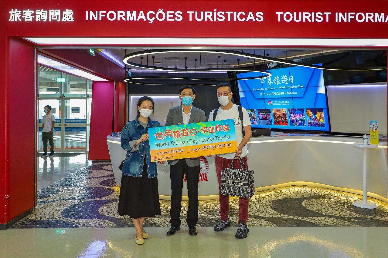 Acting Director of MGTO Ricky Hoi arrived at Outer Harbour Ferry Terminal in the morning to present welcome souvenirs to the Lucky Tourists on the World Tourism Day. Coming from Shenzhen, Mr. Li and his wife were happy to become the Lucky Tourists of the year. They expressed that they had planned in advance for spending a vacation in Macao after reinstatement of issuance of travel permits. They will stay in Macao for three days mainly for shopping and consumption in the city and sightseeing at Cotai District. In addition, souvenirs were distributed to visitors at MGTO’s Tourist Information counters throughout the day.