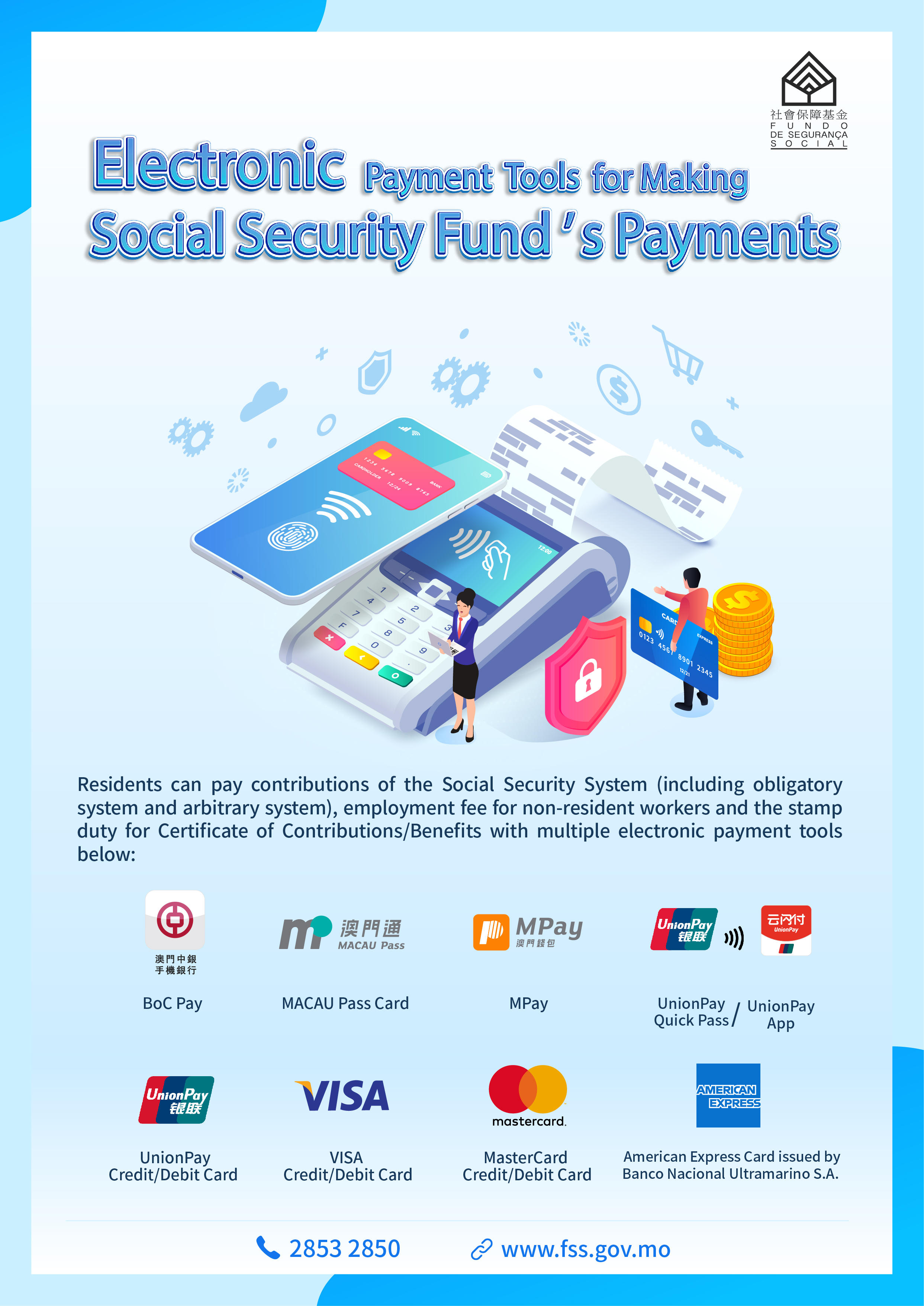 Starting from October, the service points of the Social Security Fund (abbreviated to FSS in Macao) will accept electronic payment by employers and residents for their payment of Social Security System’s contributions, employment fee for non-resident workers and stamp duty for Certificate of Contributions/Benefits, bringing greater convenience for employers and residents in their payment.