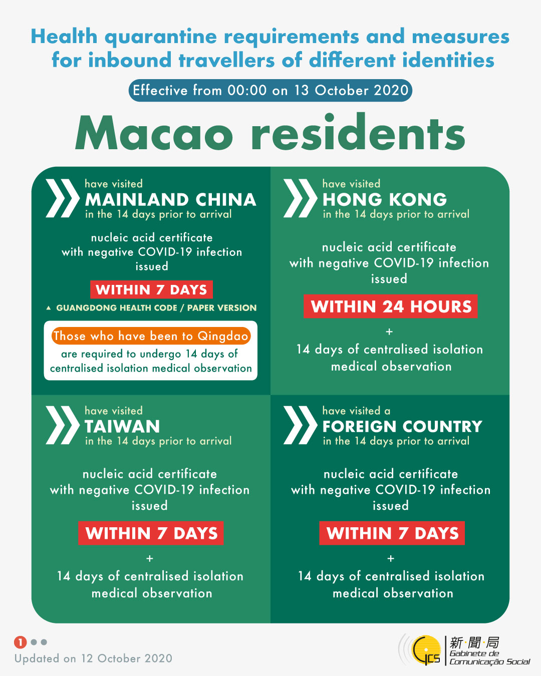 Health quarantine requirements and measures for inbound travellers of different identities, updated on 12 October 2020.