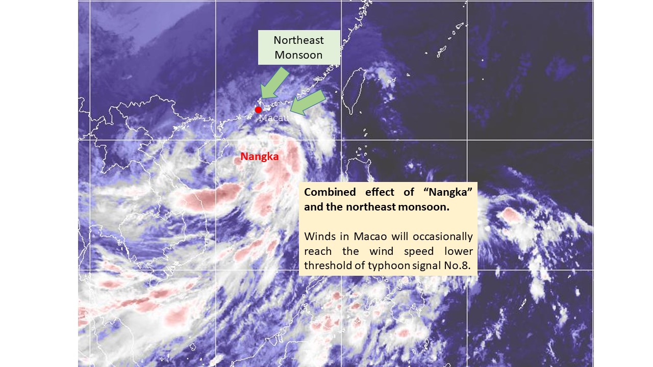 Although “Nangka” is at a distance of about 400 kilometers from Macao, under the accompanied effect of “Nangka” and the northeast monsoon, the winds in Macao are expected to maintain, with wind speed on the bridges, open areas, and high ground reaching the threshold of typhoon signal No.8 occasionally. Based on the forecasts and consideration of public safety, SMG has therefore issued Tropical Cyclone Warning Signal No.8 NE, and the signal will maintain during the day. It is expected that the outer circulation rain bands of “Nangka” will further affect Macao in the afternoon. The weather will be unstable today and tomorrow, with occasional heavy showers and thunderstorms. The public are advised to take measures against the wind and stay in safe places, and pay close attention to the latest weather news of SMG.
