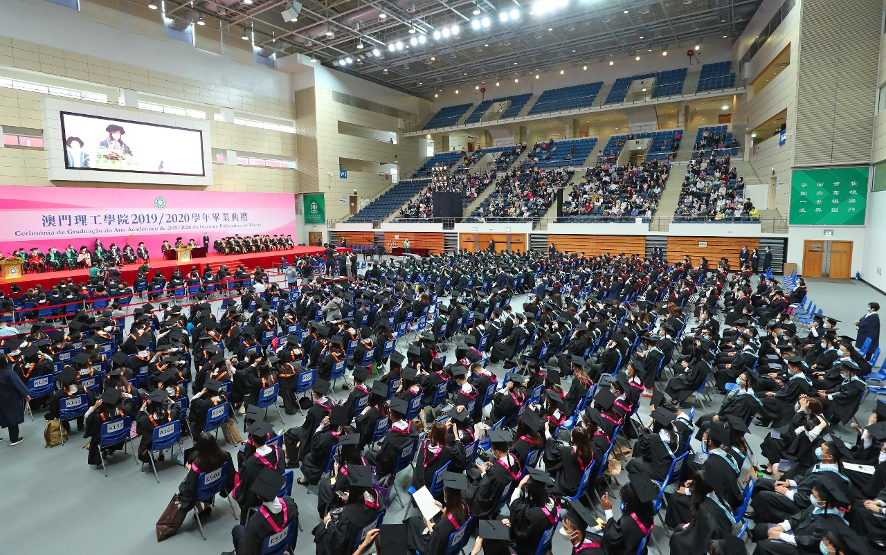 The graduation ceremony of Macao Polytechnic Institute (MPI) for the 2019/2020 academic year was held simultaneously online and on-site on the afternoon of October 22 in its Sports Pavilion. Degrees were conferred on a total of 700 graduates. At the solemn graduation ceremony, the national flag was raised and the national anthem was played. Ao Ieong U, representative of the Chief Executive and Chancellor of MPI, Secretary for Social Affairs and Culture, underscored that the SAR government will continue to support MPI in implementing the policy of "attaching dual emphasis to teaching and research", so as to train more talents and produce better scientific research results for Macao and the country.