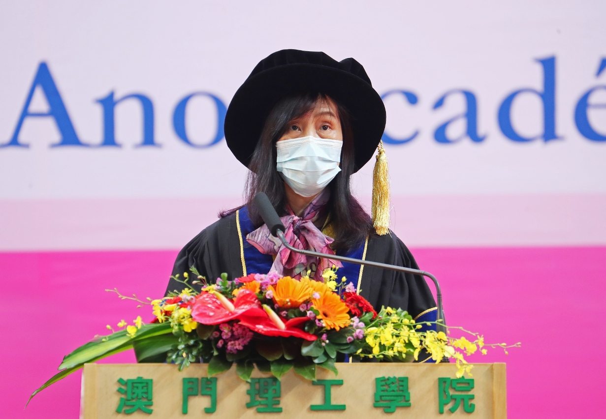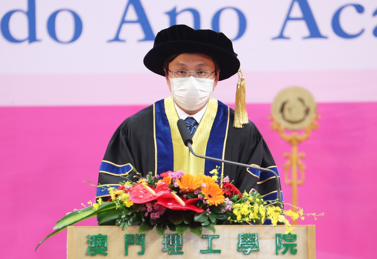 In his speech, Professor Im Sio Kei congratulated the students on overcoming the challenges brought by the coronavirus epidemic and successfully completing their studies at the Macao Polytechnic Institute. He introduced the development of MPI's teaching and research, including the establishment of the first engineering research centre in the Hong Kong and Macao regions by the Ministry of Education; MPI is the first and only tertiary institute in Macao to be awarded the "National Teaching Achievement Award" issued every four years by the Ministry of Education. Most of MPI’s programmes have been accredited by international authorities, including the first postgraduate accreditation in Macao by the International Engineering Organization (IET) this semester. MPI students won "China's National Youth Science and Technology Innovation Award"; for two consecutive years, MPI students have also won the China "Internet+" University Student Innovation and Entrepreneurship Competition organized by the Ministry of Education. All these achievements and honours testify to the national and international recognition and reputation of MPI's model of talent training and our supreme quality of teaching. He said that graduating students must stick to their original aspirations, inherit the spirit of patriotism and the love of Macao, and have a global vision; they must shoulder their mission, establish lofty goals and ambitions, and capitalize on the country’s “Belt and Road” initiative and the construction of the Guangdong-Hong Kong-Macao Greater Bay Area; they must be brave to explore, work hard, and forge ahead courageously to contribute to the development of the country and Macao.