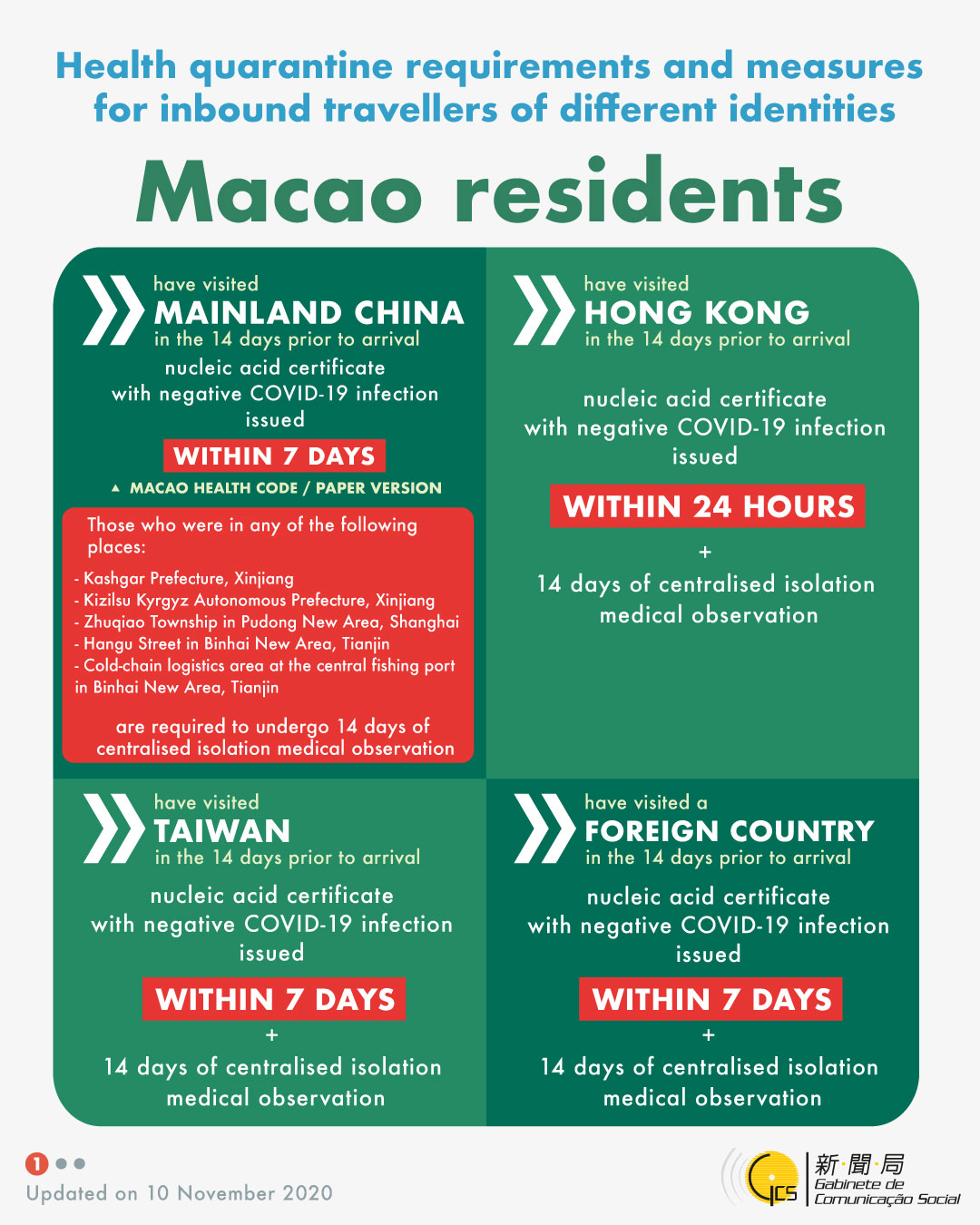 Health quarantine requirements and measures for inbound travellers of different identities, updated on 10 November 2020.