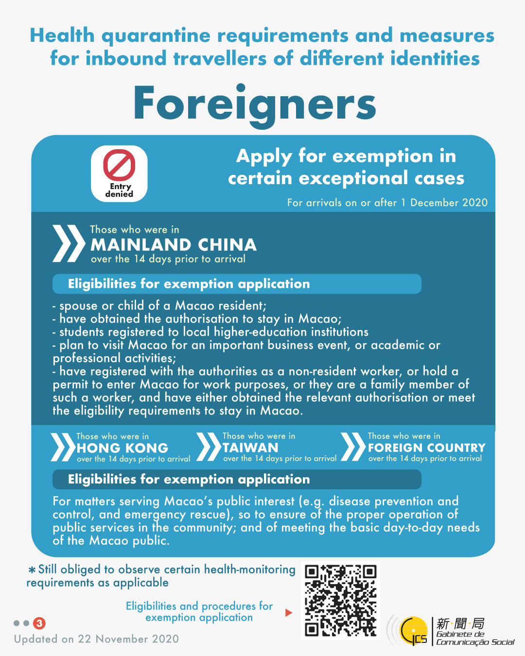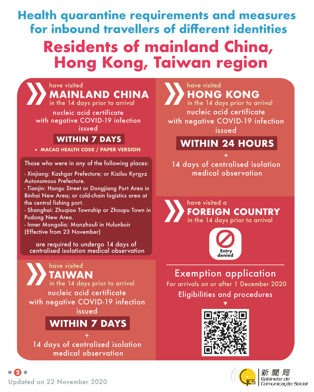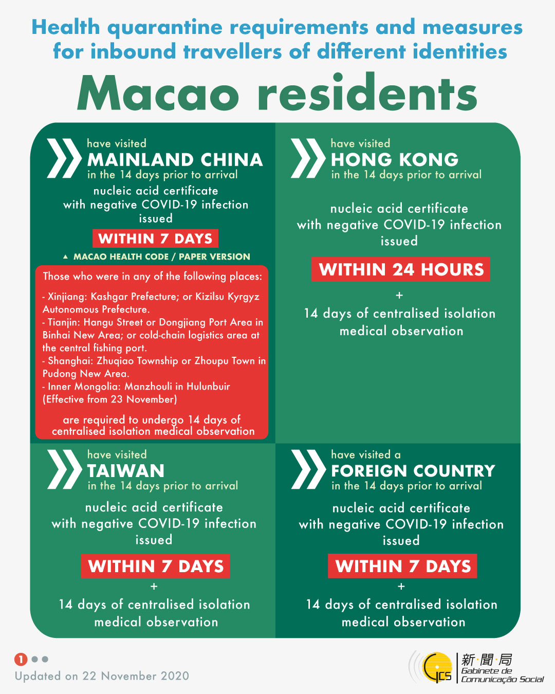 Health quarantine requirements and measures for inbound travellers of different identities, updated on 22 November 2020.