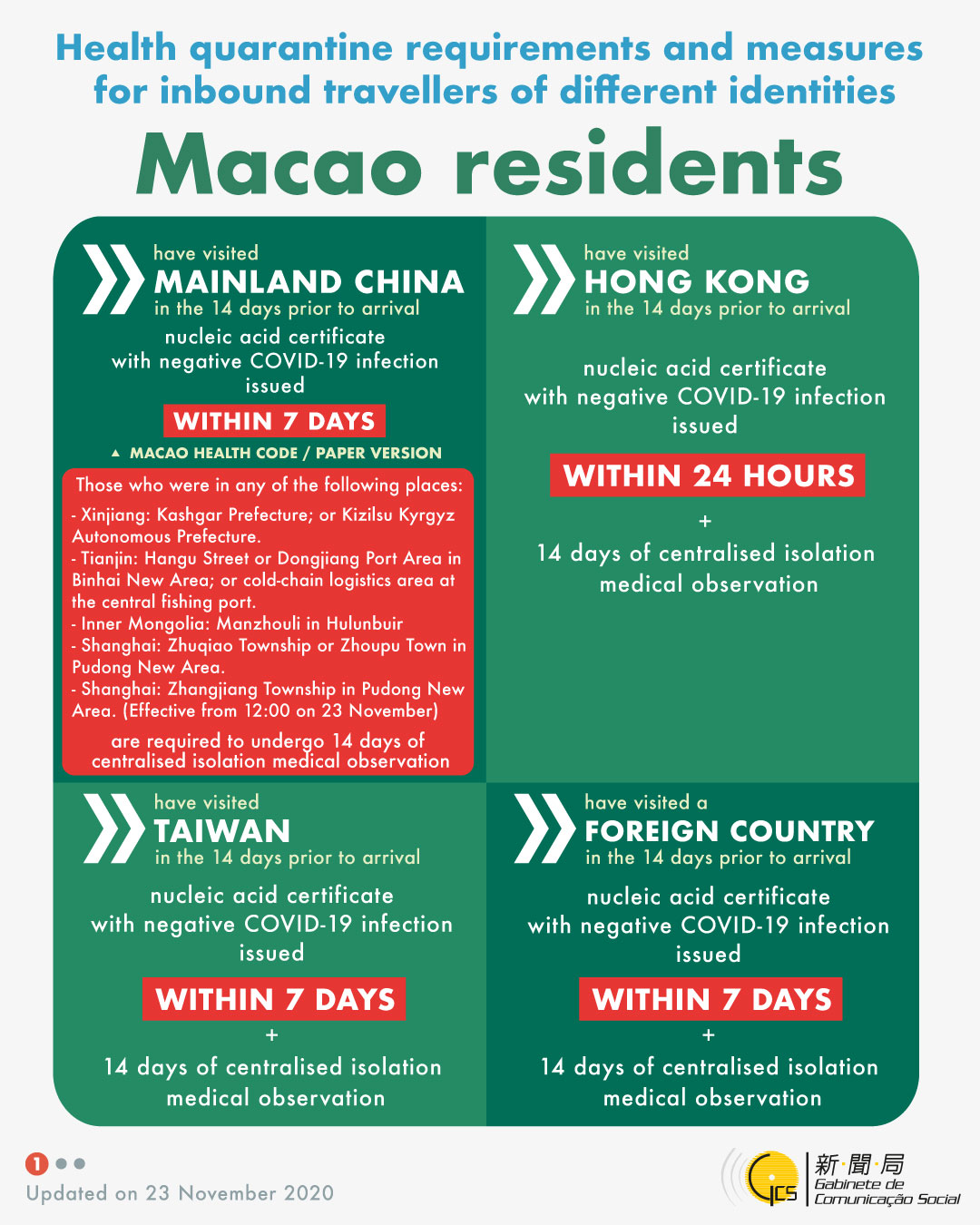 Health quarantine requirements and measures for inbound travellers of different identities, updated on 23 November 2020.