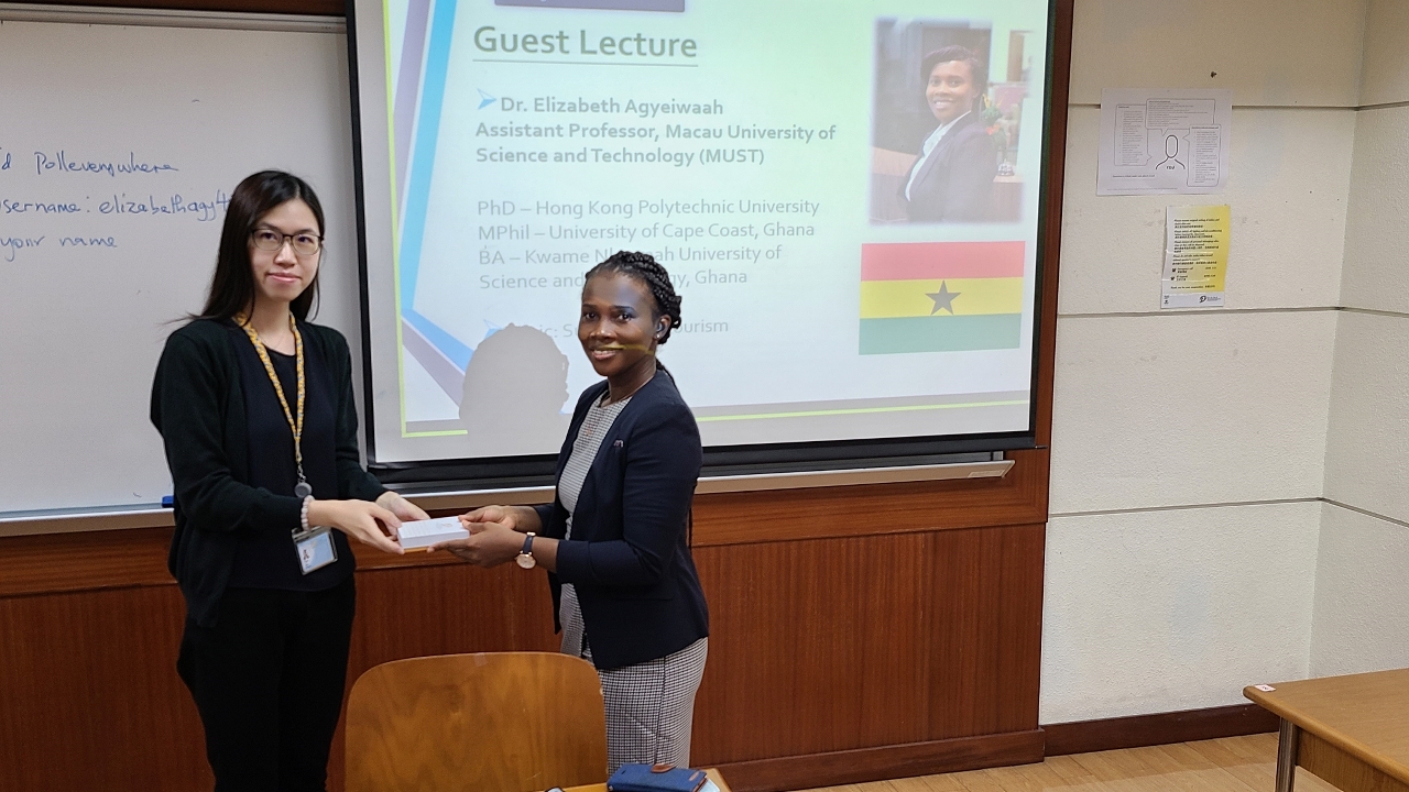 During the class, Dr. Agyeiwaah interacted with students through different online activities such as Kahoot games and Poll-everywhere application to engage students and motivate them to ask questions. At the end of the lecture, students were encouraged to share their daily life practices that can help sustain the environment and to share some of the challenges when implementing sustainable tourism practices. In addition to learning about sustainable tourism, students were also interested in learning more about Ghana, the home country of Dr. Agyeiwaah. Interesting conversations were initiated as students were curious about Dr. Agyeiwaah’s life in Macao. Students also raised questions about sustainable tourism practices implemented in Ghana compare with those in Macao.