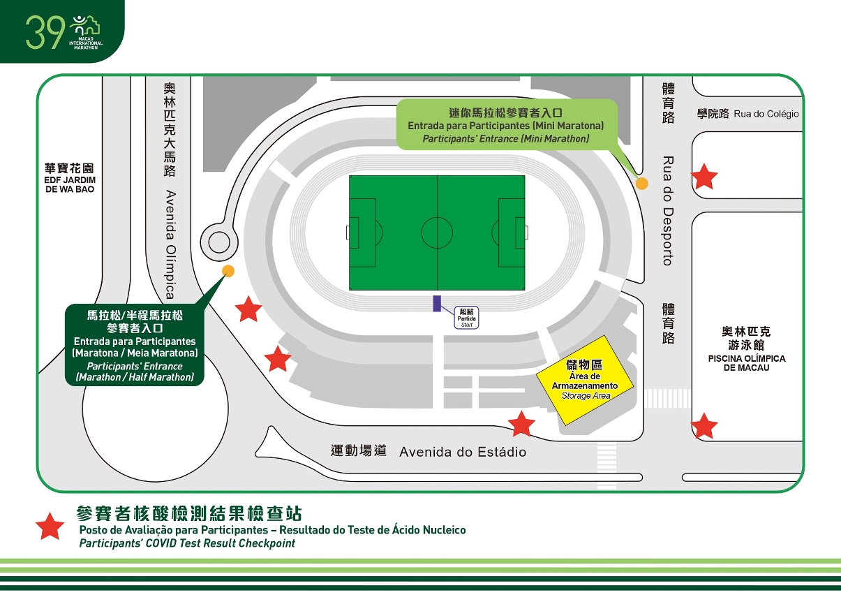 To facilitate participants upon arrival at the venue, the Organizing Committee has set up “COVID test results checkpoints around the Olympic Sports Centre Stadium. The checkpoints will be open from 4:15am. All participants must wear their bib before arriving at the checkpoints, and show their Macao Health Code and negative COVID-19 nucleic acid result to the staff. The authorized participants will then be given a wristband which they should put on before storing their personal belongings at the storage area of the Indoor Pavilion of Olympic Sport Centre from 4:30am to 5:45am. They must then undergo temperature check and enter the starting area through the entrance close to Wa Bao Garden (Marathon and Half Marathon) or through the entrance of Hockey Field (Mini Marathon). All Marathon and Half Marathon participants must arrive at the starting area before 5:50am and all Mini Marathon participants must arrive at the starting area before 6:10am. The Organizing Committee urges all participants to arrive early at the Olympic Sport Centre Stadium so that they could complete all the admission procedures as soon as possible and get ready at the starting area.