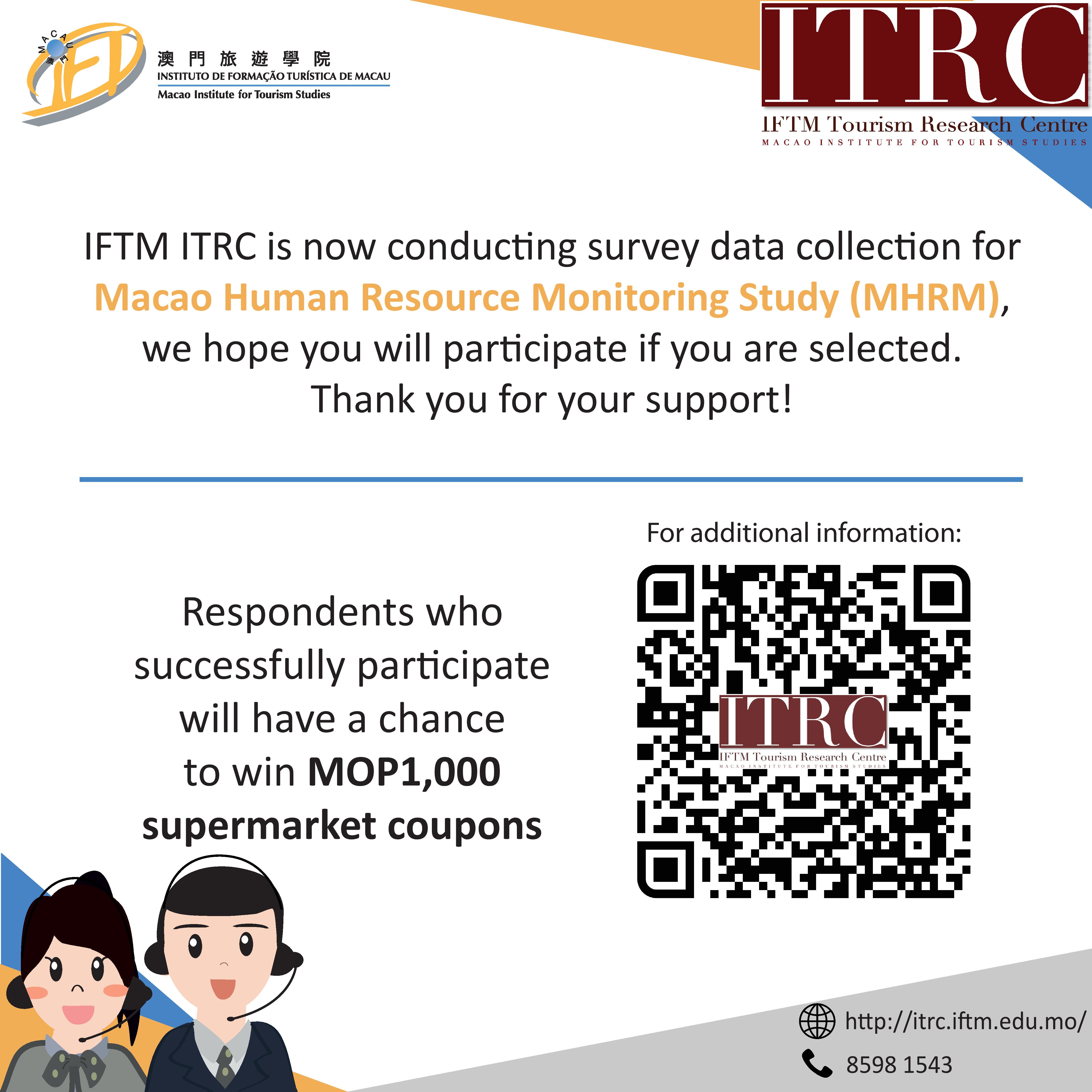 The Macao Institute for Tourism Studies Tourism Research Centre (ITRC) is now conducting survey data collection for “Macao Human Resource Monitoring Study (MHRM)” through fieldwork and telephone interview. MHRM telephone interview employs the random-digit dialing to draw a sample of eligible respondents. Selected respondents may opt to complete the questionnaire through telephone interview or fill in the online questionnaire via a given link. Qualified respondents who successfully participate will have a chance to win MOP1,000 supermarket coupons. We hope you will participate if you are selected, thank you for your support!