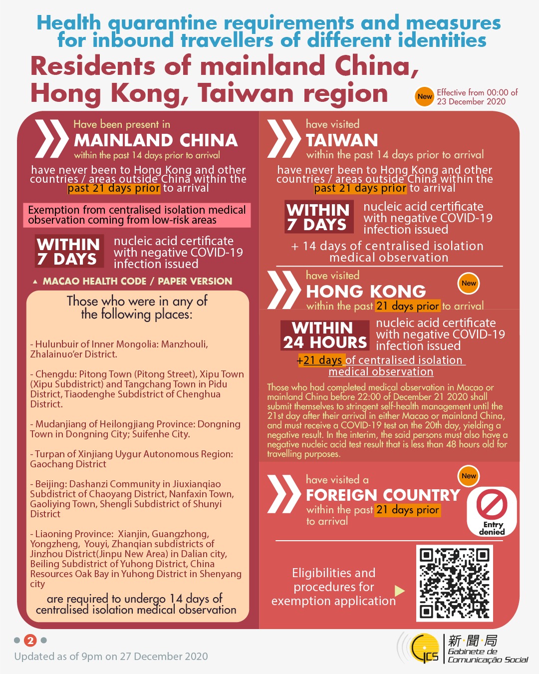 • Health quarantine requirements and measures for inbound travellers of different identities.
