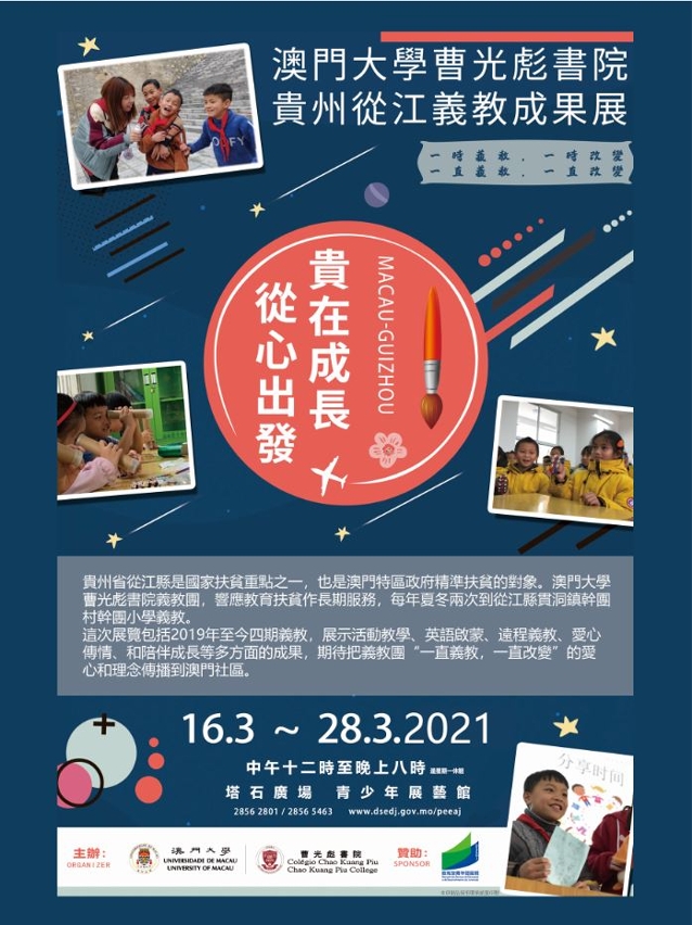 An exhibition of the University of Macau’s (UM) achievements in volunteer teaching in Congjiang, Guizhou province, will be held from 16 March to 28 March, in the Centre for Exhibitions and Artistic Shows for Young People (O Pavilhão de Exposições e Espectáculos Artísticos para Jovens). The event is organised by Chao Kuang Piu College (CKPC) at UM and sponsored by the Education and Youth Development Bureau. It will be open to the public. All are welcome.