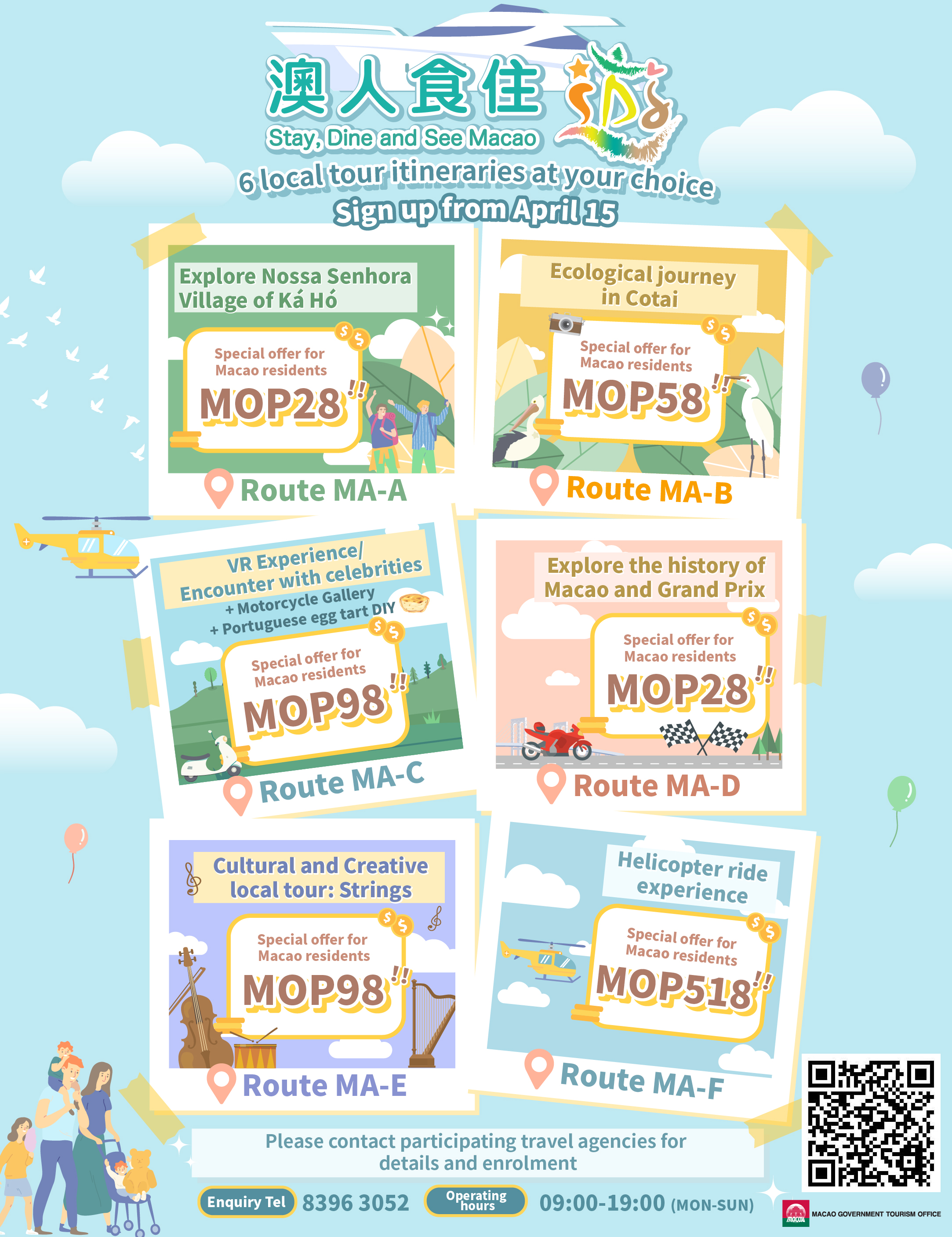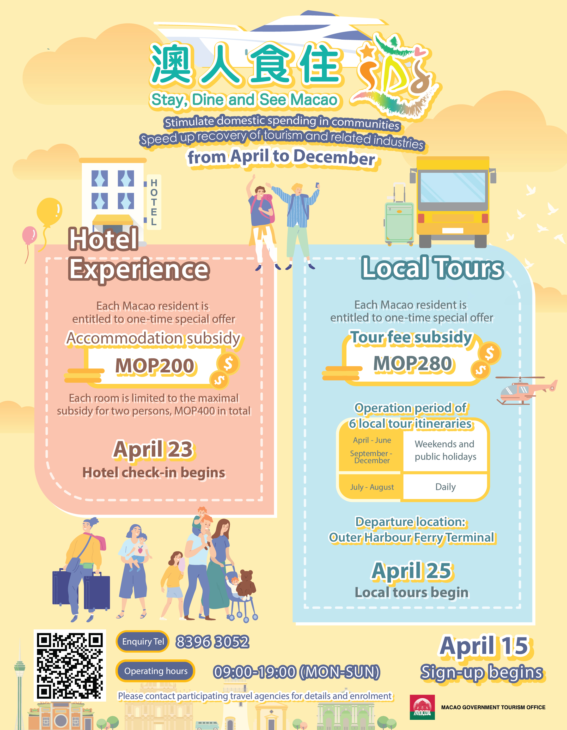 For details about joining the project for local tours and hotel experience as well as information about various travel agencies concerned, please visit the designated website: https://www.macaotourism.gov.mo/en/article/subsidies/macao-tour-hotel