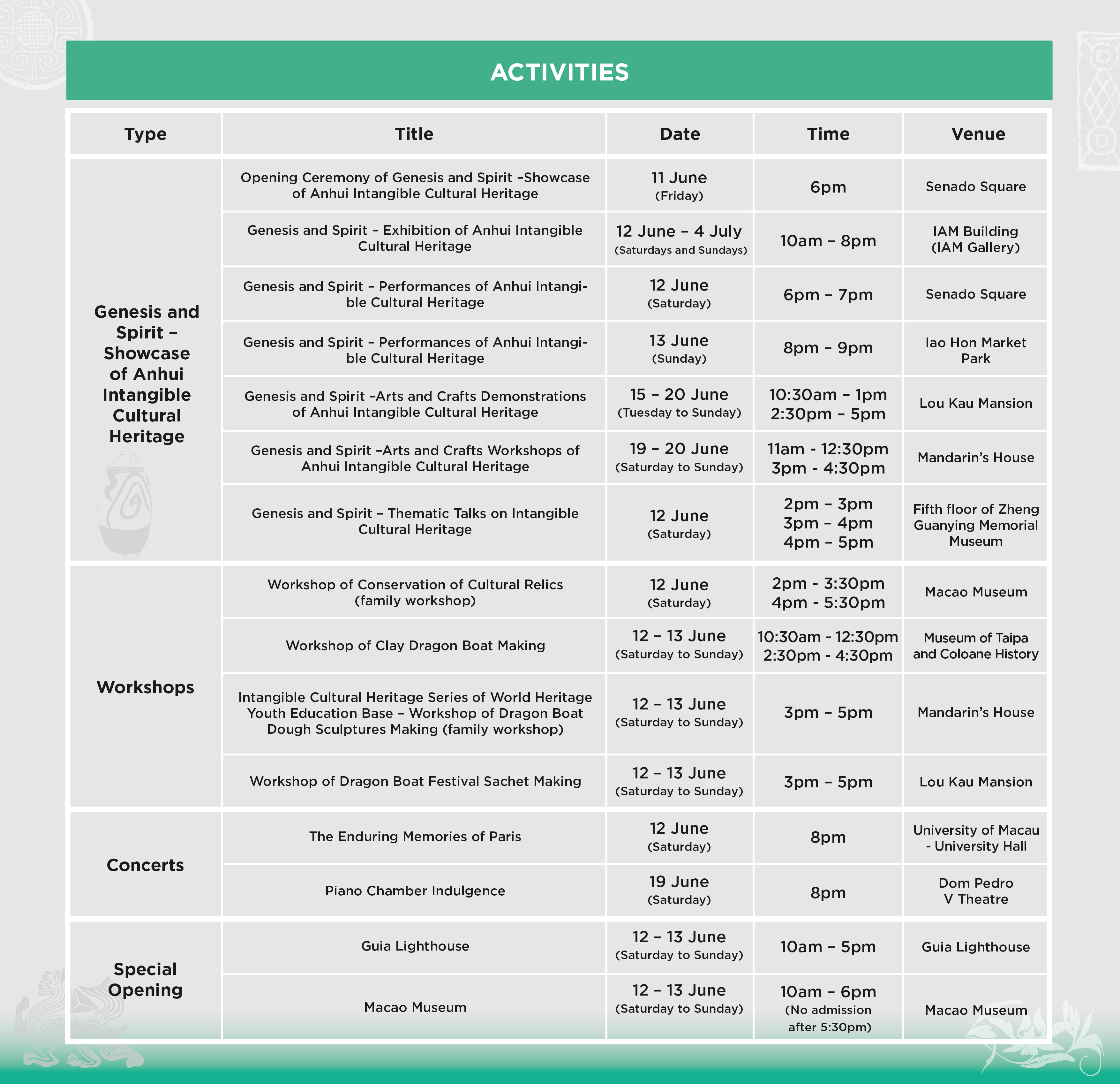 For more information about the activities celebrating the “China Cultural and Natural Heritage Day”, please contact IC at 8399 6699 during office hours, or visit IC’s website at www.icm.gov.mo/chd, official WeChat account “IC_Art_Macao” or “IC Art” page on Facebook.