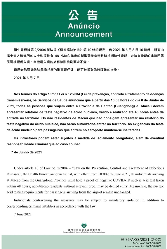 Starting from 10am on 8 June 2021, people intending to enter Macao from Guangdong Province must hold a nucleic acid test certificate – issued within 48 hours – proving they are ‘negative’ for COVID-19 infection.
