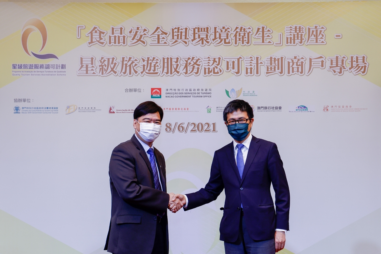 Macao Government Tourism Office (MGTO) and Municipal Affairs Bureau (IAM) jointly organized the “Seminar on Food Safety and Environmental Hygiene” – special session for merchants accredited by the Quality Tourism Services Accreditation Scheme (QTSAS), to raise pertinent businesses’ concern about food safety as well as their awareness on prevention against COVID-19 and food safety among other related aspects, so that visitors can enjoy a safe travel experience in Macao.