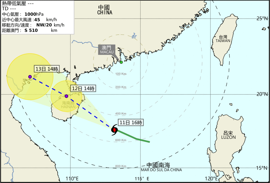 The low pressure over the South China Sea has intensified into a tropical depression, which will come closest to Macao between tonight and tomorrow about 500km southwest of Macao. It will generally move towards Hainan Island. Under the influence of its circulation, the wind in Macao will increase significantly from tonight to tomorrow, with winds reaching level 6 and with showers occasionally. At the same time, under the combined effects of the astronomical tide and strong winds, the area in the inner harbor may be flooded tomorrow morning. The flooding height is predicted to be below 0.5 meters. The public are advised to pay attention to the latest storm news and take preventive measures.