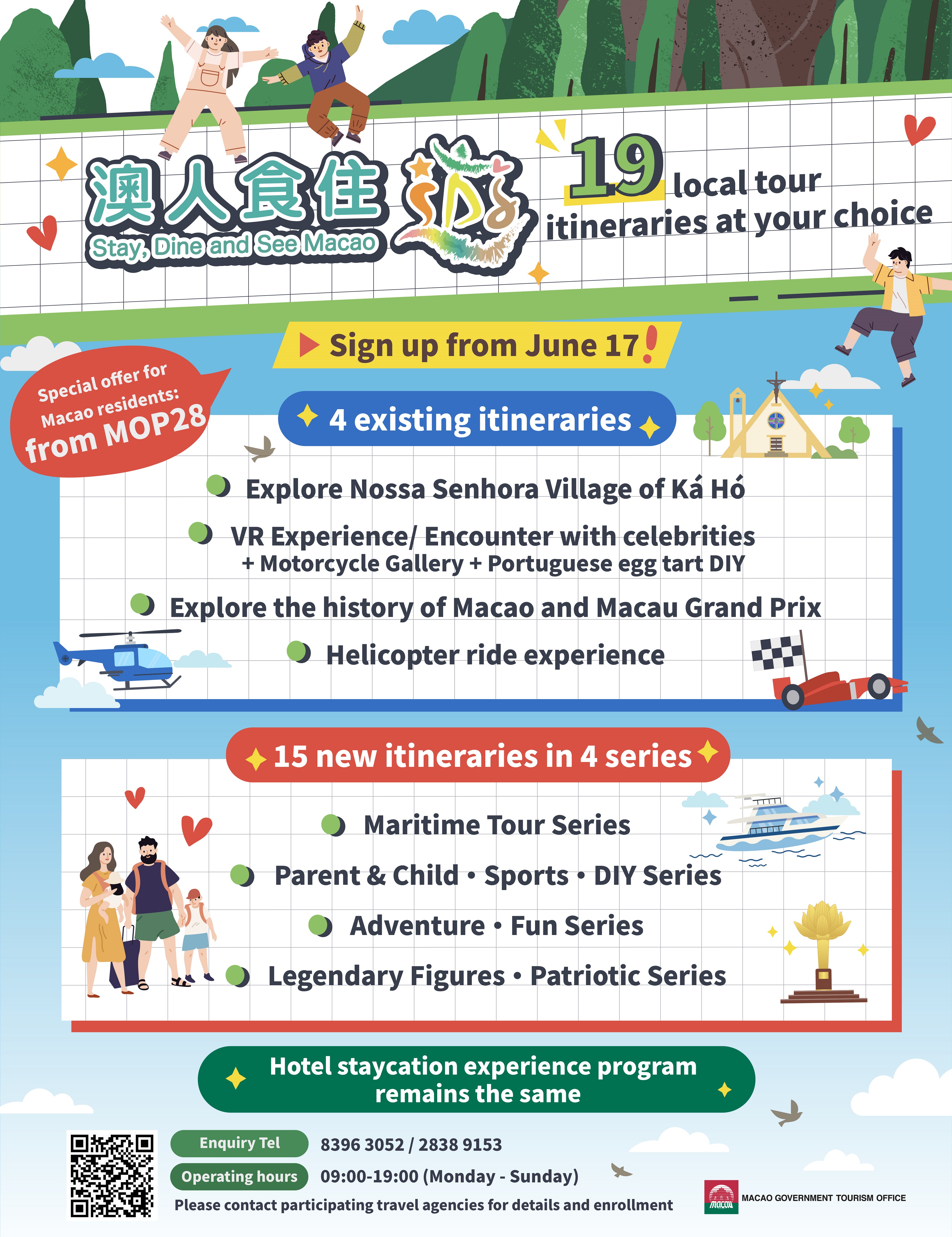 For details about enrollment for local tours and hotel experience under the project as well as information about various travel agencies concerned, please visit the designated website: https://www.macaotourism.gov.mo/en/article/subsidies/macao-tour-hotel (The English version of the new itineraries is coming up soon). For other enquiries, please dial 83963052/28389153 between 9 a.m. and 7 p.m.