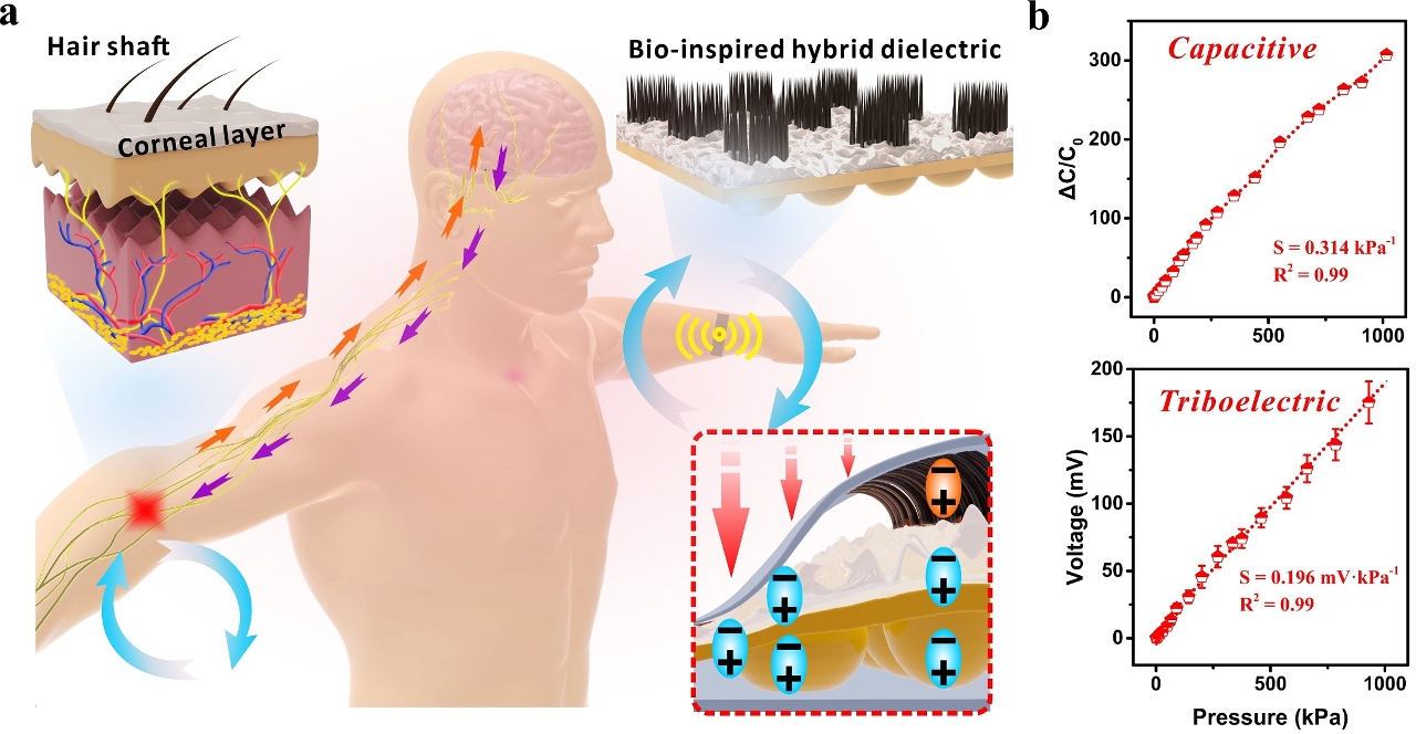 Inspired by the structure of human skin, the research team has designed a novel hybrid dielectric composed of a low-k micro-cilia array, a high-k rough surface, and a micro-dome array. The hybrid dielectric has gradient dielectric properties and compressibility, and can be converted in series and parallel between low-k and high-k components under pressure to meet the linear variation of dielectric and mechanical properties with pressure, thus realising a capacitive sensor with linearity and stable sensitivity over a wide range of up to 1000 kPa. The hybrid dielectric is also suitable for triboelectric tactile sensors, where the hybrid structure with linear dielectric behaviour not only enhances triboelectrification and electrostatic induction, but also enables linear variation in effective surface charge density. As a result, the triboelectric sensor can serve as a self-powered device, effectively converting external tactile stimuli into voltage signals over a wide pressure range of up to 1000kPa, for real-time monitoring of human health and motion detection.