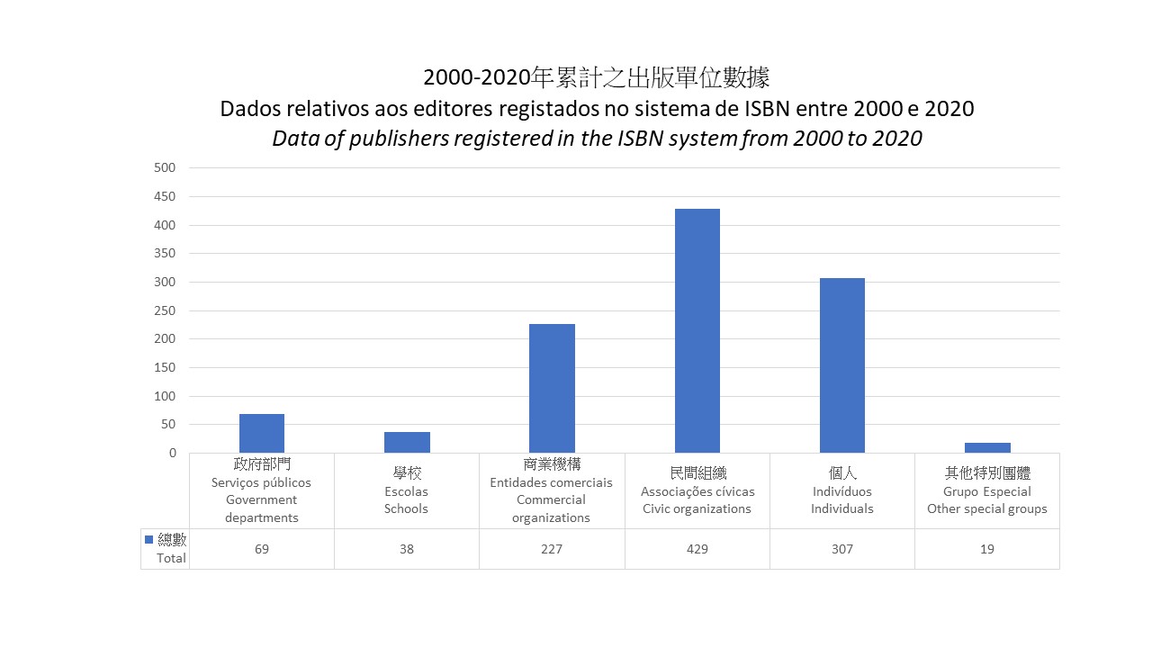 In 2020, a total of 70 new publishers submitted applications to join the ISBN system (including 1 government department, 3 schools, 23 commercial organizations, 10 civic organizations and 33 individuals), adding up to an accumulative total of 1,089 publishers (categories of publishers: 69 government departments, 38 schools, 227 commercial organizations, 429 civic organizations, 307 individuals and 19 other special groups). This shows a 17-fold increase in comparison with the 62 publishers registered in 2000 when the ISBN Agency was founded. The data shows a steady development of the publishing industry in the Macao SAR and an increased awareness of ISBN application among publishers. The international standardization of book publication has facilitated the promotion of Macao’s books in the international market.