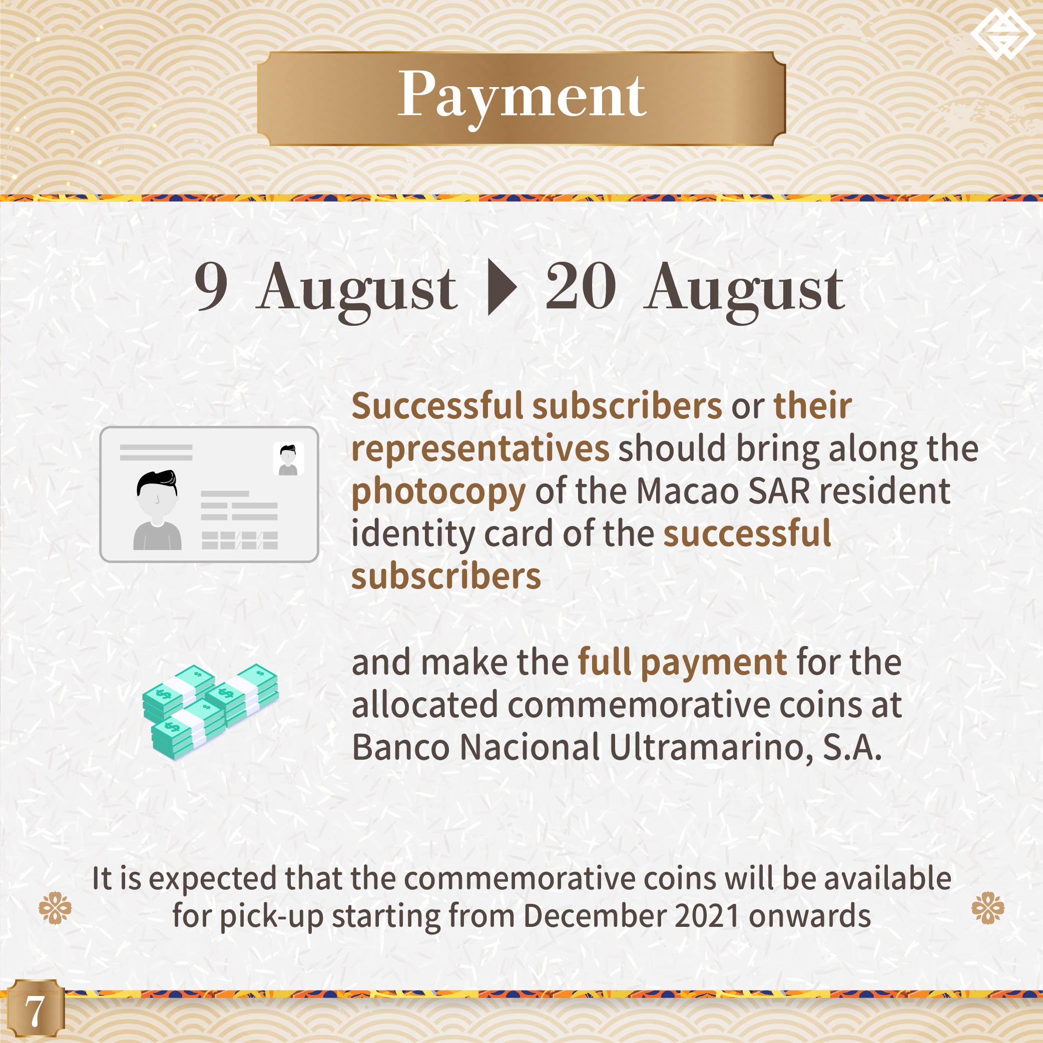 Successful subscribers or their representatives should bring along the photocopy of the Macao SAR resident identity card of the successful subscribers and make the full payment for the allocated commemorative coins at Banco Nacional Ultramarino, S.A. between 9 August and 20 August 2021. It is expected that the commemorative coins will be available for pick-up starting from December 2021 onwards.