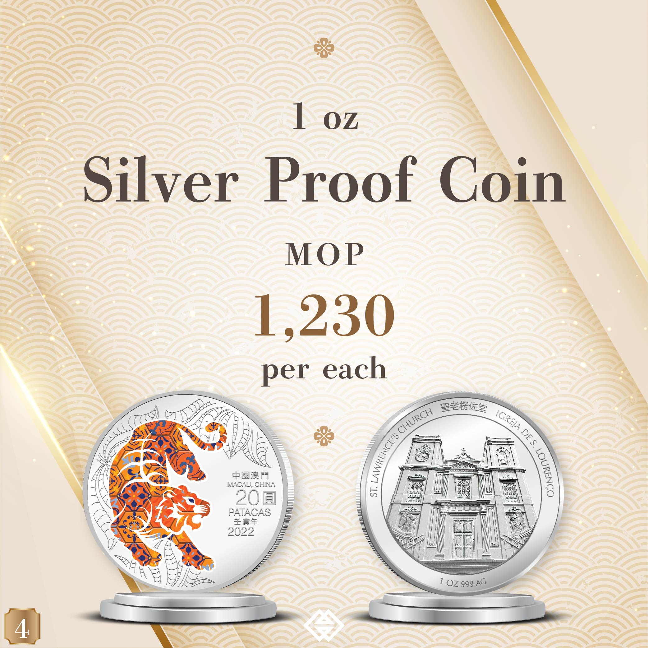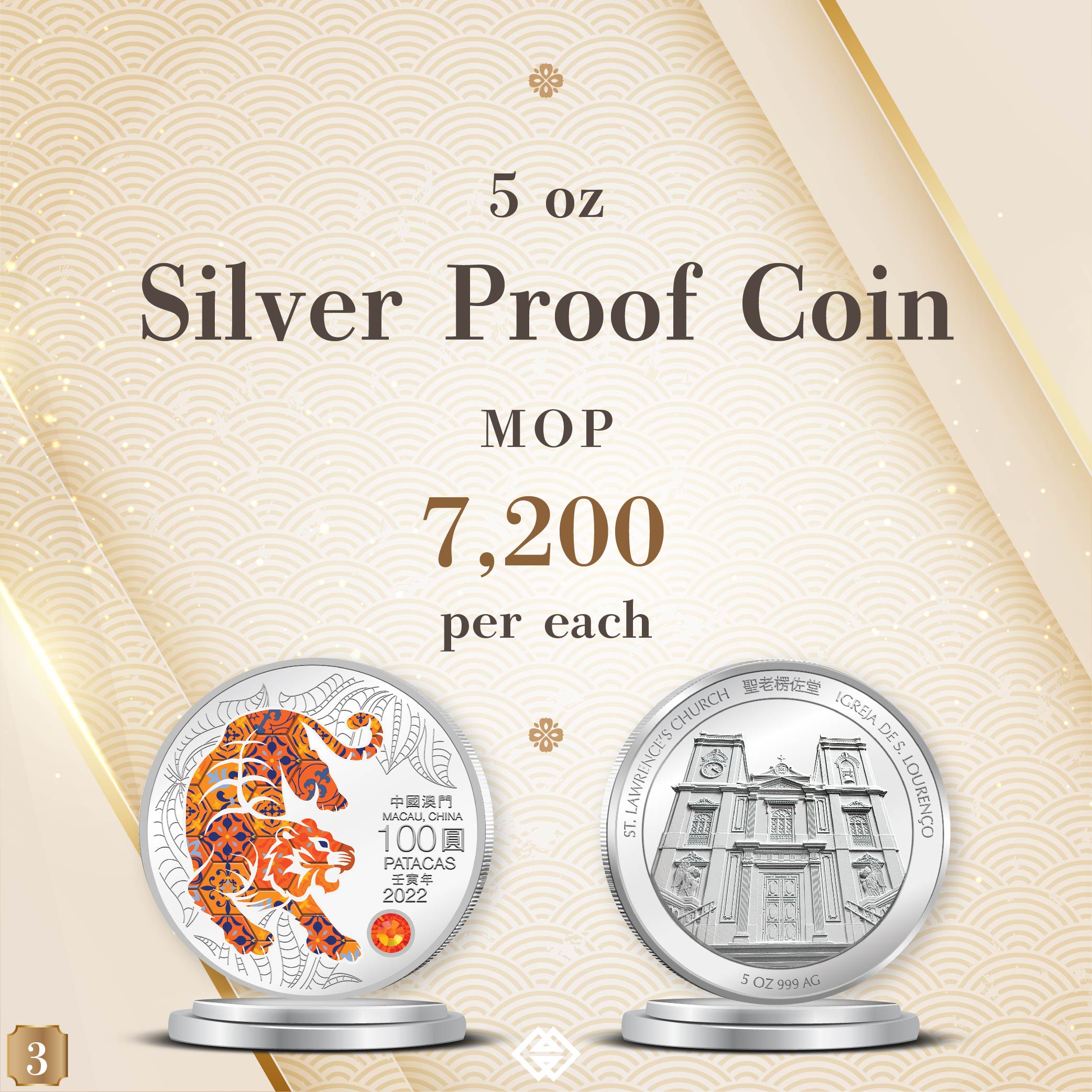 The obverse design of 2022 Year of the Tiger commemorative coins features the outline of the Chinese Zodiac sign, portrayed with a vibrant display of the distinctive Portuguese-inspired patterned tiles. The reverse design features a World Heritage Site of Macao in a low angle perspective presentation, sculpted in the latest angular high relief minting technique. The Year of the Tiger commemorative coins comprise a 1 oz and a 5 oz Silver Proof coin as well as a 0.5 oz Gold Proof coin. The selling price of the coins is MOP1,230, MOP7,200 and MOP15,000 respectively.