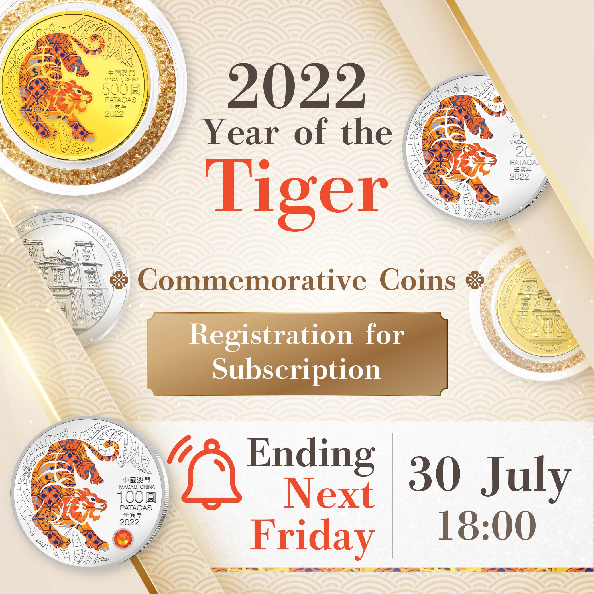 The online subscription period for the 2022 Year of the Tiger commemorative coins (AMCM) will end at 6:00pm on 30 July 2021 (next Friday).  Hence, AMCM would like to remind Macao residents who are interested in subscribing for the said coins to complete the online subscription process before the mentioned deadline ( https://www.amcm.gov.mo/static/COCSCollection/terms_pt.html ).  A service counter has also been set up at the lobby of AMCM during the mentioned time period to provide registration service for those elderly citizens who require assistance.  For enquiries, please call our hotline at 28565071 or visit our webpage.