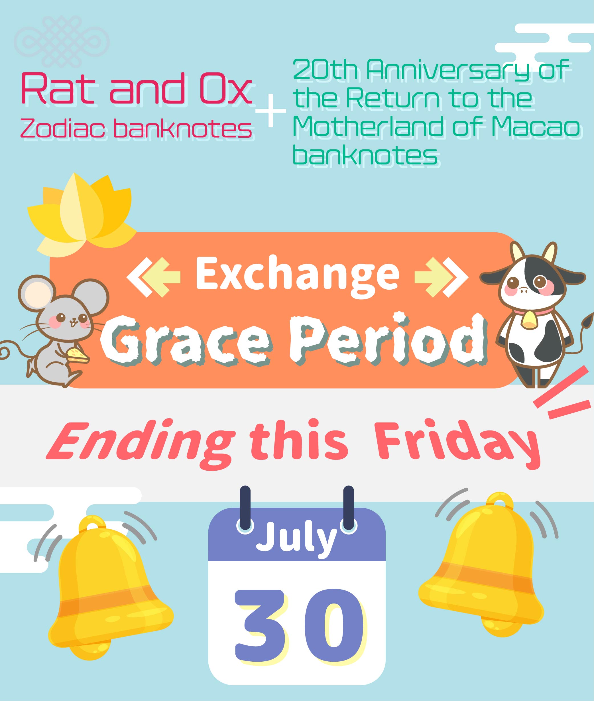 The grace period for the Rat and Ox Zodiac banknotes and the previously issued 20th Anniversary of the Return to the Motherland of Macao banknotes will end on 30 July 2021 (Friday). The Monetary Authority of Macao would like to remind those registrants who have not yet conducted the note exchange to exchange for their subscribed notes at their previously selected bank on or before this Friday.