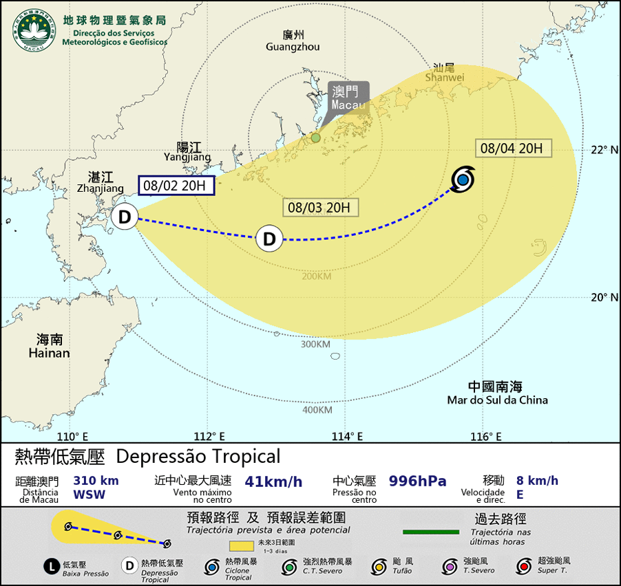 The tropical depression is now located near the western coast of Guangdong. It is forecasted to intensify and move eastwards towards the northern part of the South China Sea, bringing unsettled weather to the coast of Guangdong. Occasional heavy showers and thunderstorms are expected in Macao, and winds will intensify with gusts. The tropical depression will move closest to Macao between nighttime on 3rd and early morning on 4th. As its track is still uncertain, members of the public are advised to pay close attention to the change in weather and the latest tropical cyclone information.
