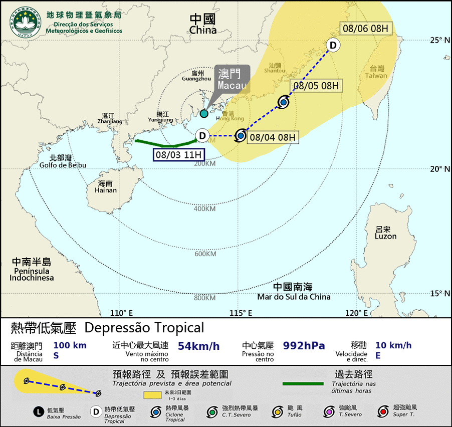 The tropical depression south of the Pearl River Estuary continues to strengthen and is taking a faster and more northerly path than expected. It will come closest to Macau during the day today, passing within 100 km of Macau, and therefore the probability of issuing the Tropical Cyclone Warning Signal No.3 was changed from “relatively low to medium” to “medium”. It is expected that there will be heavy showers during the day in Macau, and the wind will strengthen and there will be gusts. Although the circulation of the tropical depression is relatively small, its path is close to the Pearl River Estuary and it is continuously strengthening. Therefore, SMG may consider issuing Tropical Cyclone Warning Signal No.3 this afternoon depending on the situation. The public are advised to pay close attention to the change in weather and the latest storm news.