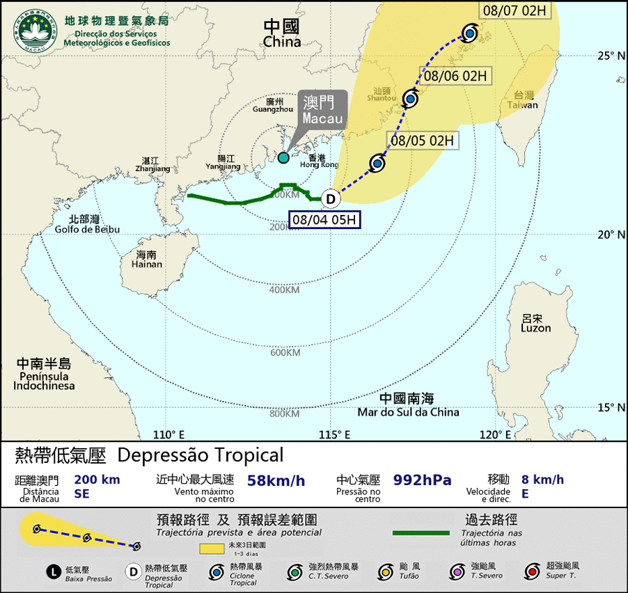 The tropical depression in the sea area southeast of the Pearl River Estuary is moving away from Macao and is generally moving towards the eastern coast of Guangdong. Tropical Cyclone Warning Signal No.1 has been issued. However, affected by its outer circulation, occasional showers and thunderstorms are still expected in Macao, the winds over the bridges are expected to be occasionally fresh and gusty. The public is advised to pay close attention to the change in weather, the latest storm news and also the possibility of flooding caused by heavy rains.