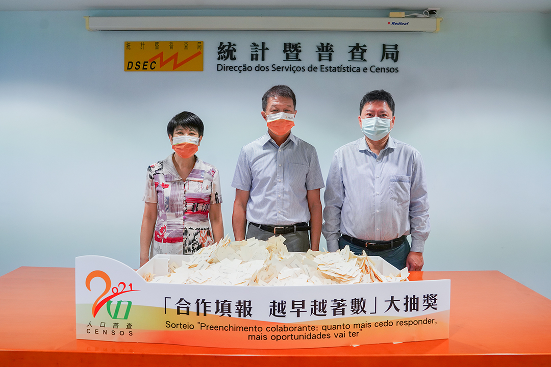 Data collection for the 2021 Population Census has been successfully concluded. In appreciation for the support and cooperation from households, households who completed the Census questionnaire between 7 and 21 August will be automatically entered into the Early Census Response for Greater Chance of Winning Lucky Draw. The grand prize draw took place today (31 Aug), and Director Ieong Meng Chao, Deputy Director Cheng I Wan and Deputy Director Mak Hang Chan of the Statistics and Census Service (DSEC) drew a total of 15 winning households. The reference numbers of the winning households are as follows: 011141024; 012400412; 012440367; 012640885; 012870625; 013630558; 013691250; 013840365; 021870849; 031160301; 032561188; 051140649; 062561146; 093481183 and 094770185. A winning notification letter will be mailed to the winning households and they may select a prize from the list of grand prizes which include latest computers, smart TV, furniture vouchers worth MOP6,000 and domestic sports goods.