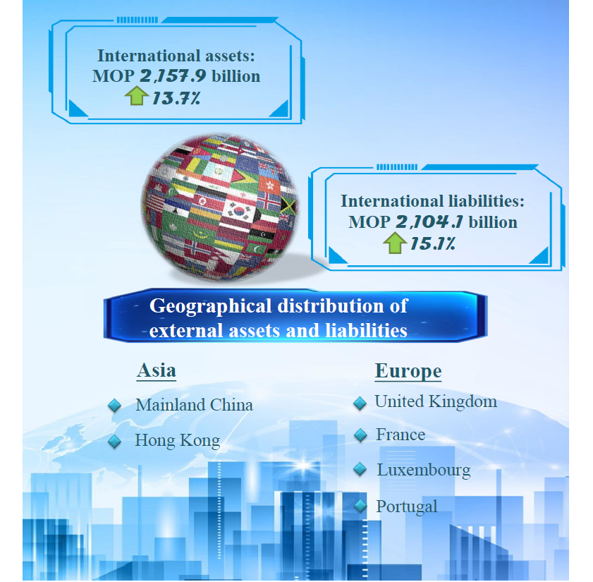 The majority of external assets and liabilities of the local banking sector were related to Asia and Europe. At end-September 2021, claims on Mainland China and Hong Kong occupied 43.4% and 28.1% of total external assets, while claims on Luxembourg and Portugal both took up 0.9%. Meanwhile, claims on Portuguese-speaking countries and countries along the “Belt and Road” occupied respective shares of 1.3% and 8.0%. On external liabilities, Mainland China and Hong Kong accounted for 39.8% and 36.0% of the total respectively, while the United Kingdom and France took up corresponding shares of 5.0% and 4.2%. Portuguese-speaking countries and countries along the “Belt and Road” represented 0.6% and 7.6% respectively.