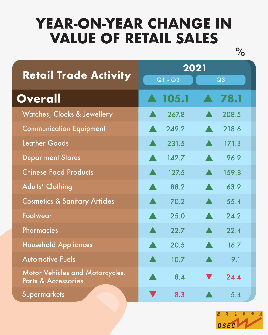 Information from the Statistics and Census Service (DSEC) indicated that value of retail sales for the third quarter of 2021 totalled MOP15.98 billion, up by 78.1% year-on-year. After removing the effect of price changes, the sales volume index surged by 86.5% year-on-year.