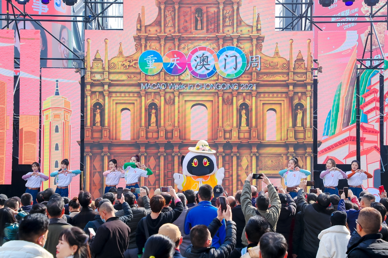 For five days in a row, the mega roadshow is staged at Jiefangbei Square at Yuzhong District in Chongqing to showcase Macao’s colorful dimensions of tourism, trade and commerce, culture and creativity, sports, entertainment and more through an array of zones/booths themed as follows: overview about Macao and its gastronomy, festivals and events; MAK MAK Shop; Macao Good Shop; Macao’s sport events; “A glimpse into Macao Grand Prix Museum”; Macao’s tourism products for sale; trade, commerce and economy of Macao; an informative display by Economic and Technological Development Bureau, as well as a showcase of Macao’s tourism industry presented by pertinent integrated tourism enterprises and airline company. There is also a tourist information counter offering Macao travel tips on site and sharing with Chongqing residents about the requirement for visitors to Macao to present valid proof of negative result of a COVID-19 nucleic acid test taken within an extended period of seven days without requirement of medical observation. Staffers at various booths devote great efforts to promote Macao’s distinctive elements, while Macao Tourism Mascot MAK MAK appears for a friendly encounter with residents and visitors in Chongqing, striving to boost their intention to visit Macao.