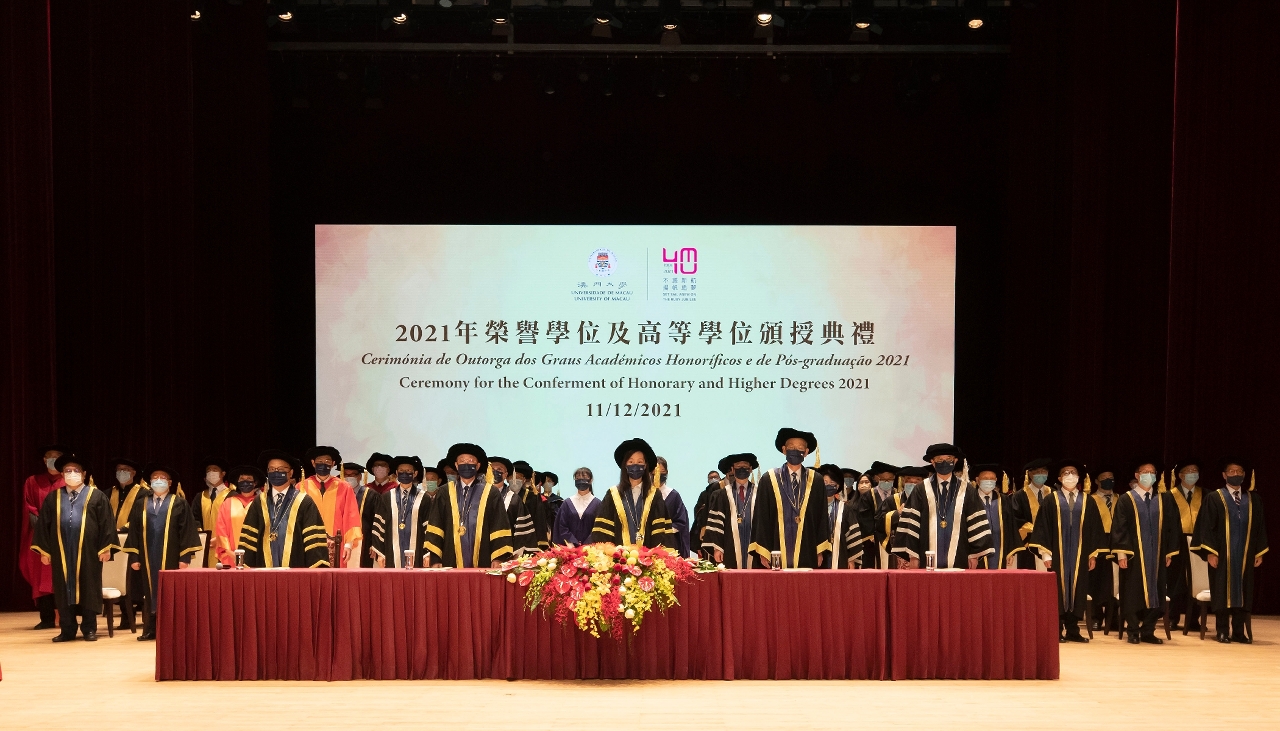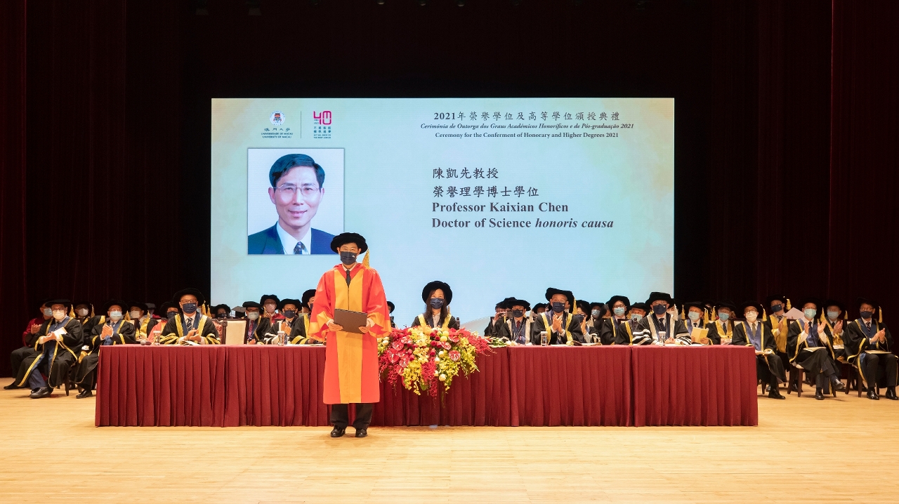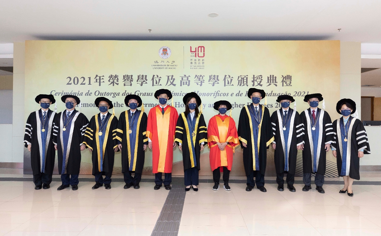 The University of Macau (UM) today (11 December) held the Ceremony for the Conferment of Honorary and Higher Degrees 2021 to confer honorary doctorates on Prof Lawrence Juen-yee Lau, Prof Kaixian Chen, Prof Shuji Nakamura, Prof Li Lanjuan, Prof Lee Hau Leung, Prof Zhu Lilan, and Ms Chio Fai Aglaia Kong in recognition of their outstanding achievements and significant contributions to social development and education.