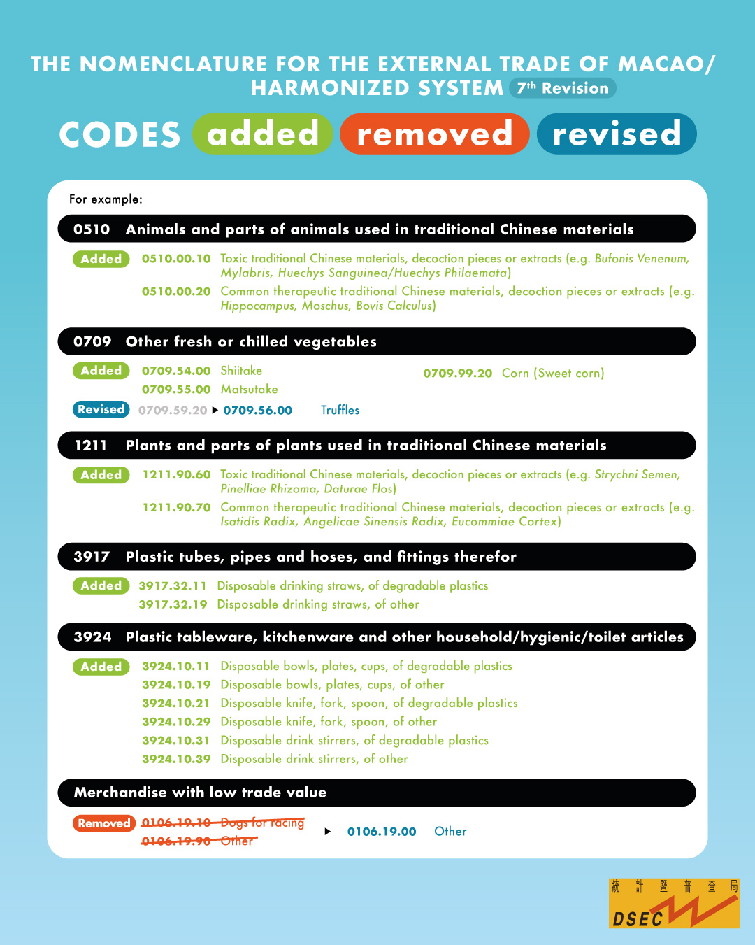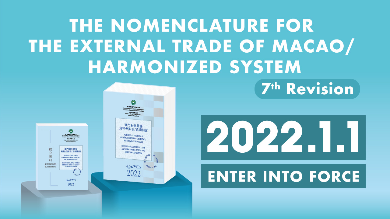 The Nomenclature for the External Trade of Macao/Harmonized System, 7th Revision (NCEM/HS, Rev.7), approved under the Executive Order No. 57/2021, will come into effect on 1 January 2022. This revision is conducted in accordance with the recommendations from the World Customs Organization, and in conformity to the relevant regulations of imports and exports of chemicals under the Chemical Weapons Convention, the Rotterdam Convention, the Stockholm Convention and the International Narcotics Control Board. Moreover, classification of commodities is optimized in line with the operations of the Montreal Protocol and the Basel Convention to strictly regulate greenhouse gases and electronic waste that pollutes the environment. In terms of local context, the revised content aims to meet the needs of social development, such as the implementation of the “Law on Traditional Chinese Pharmacies and Registration of Traditional Chinese Medicines” by the Health Bureau, the regulation of weapons by the Public Security Police Force and the recommendations from the Environmental Protection Bureau for the prevention and reduction of environmental pollution, etc.