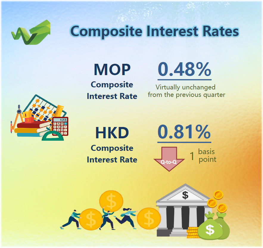 Macao’s composite interest rates are the weighted average interest rates of all interest-bearing liabilities and non-interest-bearing demand deposits on local banks’ books. These statistical indicators facilitate the financial sector to closely track movements in domestic funding costs.