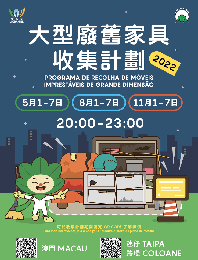 The public can dispose of large unwanted furniture items at the specified temporary collection points during the mentioned period and time. Signs will be installed next to the collection points so that the public can identify them. The detailed locations can be obtained by referring to the poster, the IAM Environment Information Webpage www.iam.gov.mo/macaohygiene and Wechat account, or by calling the IAM Civic Service Hotline 2833 7676 for enquiries. To avoid accumulation of garbage, IAM will coordinate with the cleaning contractor to increase the number of staff and vehicles to collect the unwanted furniture items at the collection points in the mentioned period, and will remove all the items from the collection points within the night.