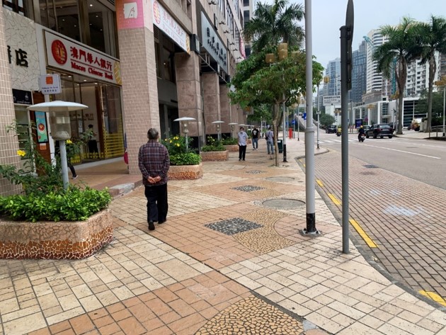 Some of the road surfaces of pavements in the NAPE area have shown signs of cracks and damage due to subsidence. Meanwhile, comments about the road surface of the section being slippery on rainy days have also been received from the public. IAM launches optimisation works to reorganise a section of road surface from Avenida Dr. Sun Yat-Sen to Rua Cidade de Sintra to improve the pedestrian environment and barrier-free facilities and add green elements. In response to the suggestion of DSAT, reorganisation and facilitation of the dynamic flow of vehicles are also carried out through these optimisation works. Three straight traffic lanes will be set in the originally bent carriageway and the positions of zebra-crossings will be adjusted. Following the traffic reorganisation and adjustment design, IAM will re-pave six sections of pavements in phases, lay anti-slip porous tiles to increase anti-slip properties, add barrier-free access ramp, lower the kerbs at zebra-crossings, lay danger warning tiles and add guidance tiles for the visually impaired to improve the barrier-free walking system in the area. After the reorganisation of the pavements, both covered and non-covered pavements will span a total width of 6 metres.