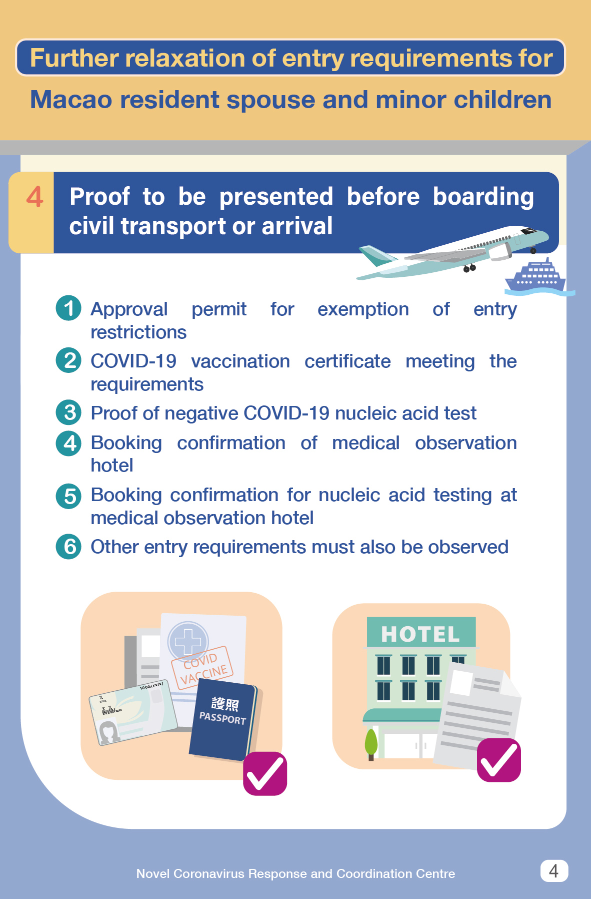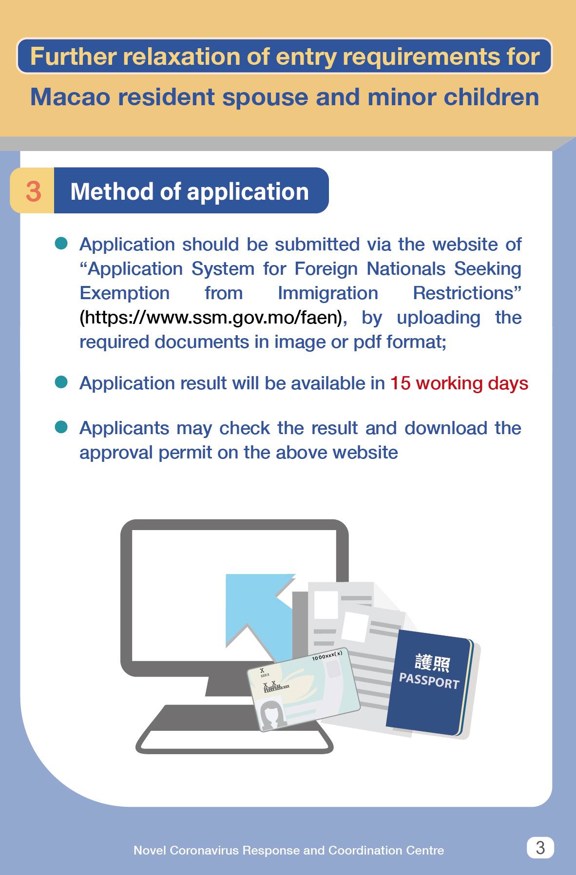 Taking into account the actual needs of local residents and assessing the epidemic risks and changes in relevant countries, the Novel Coronavirus Response and Coordination Centre (hereinafter referred to as the “Centre”) announces, in accordance with the stipulations in clause 3 of Chief Executive Dispatch No. 64/2022, that with effect from 30 May 2022, non-resident spouse and minor children of Macao residents who are unqualified to enter Macao under other entry restrictions exemption schemes may, subject to prior authorization from the health authorities and the prerequisite of fulfilling other entry conditions, enter into the Macao Special Administrative Region.