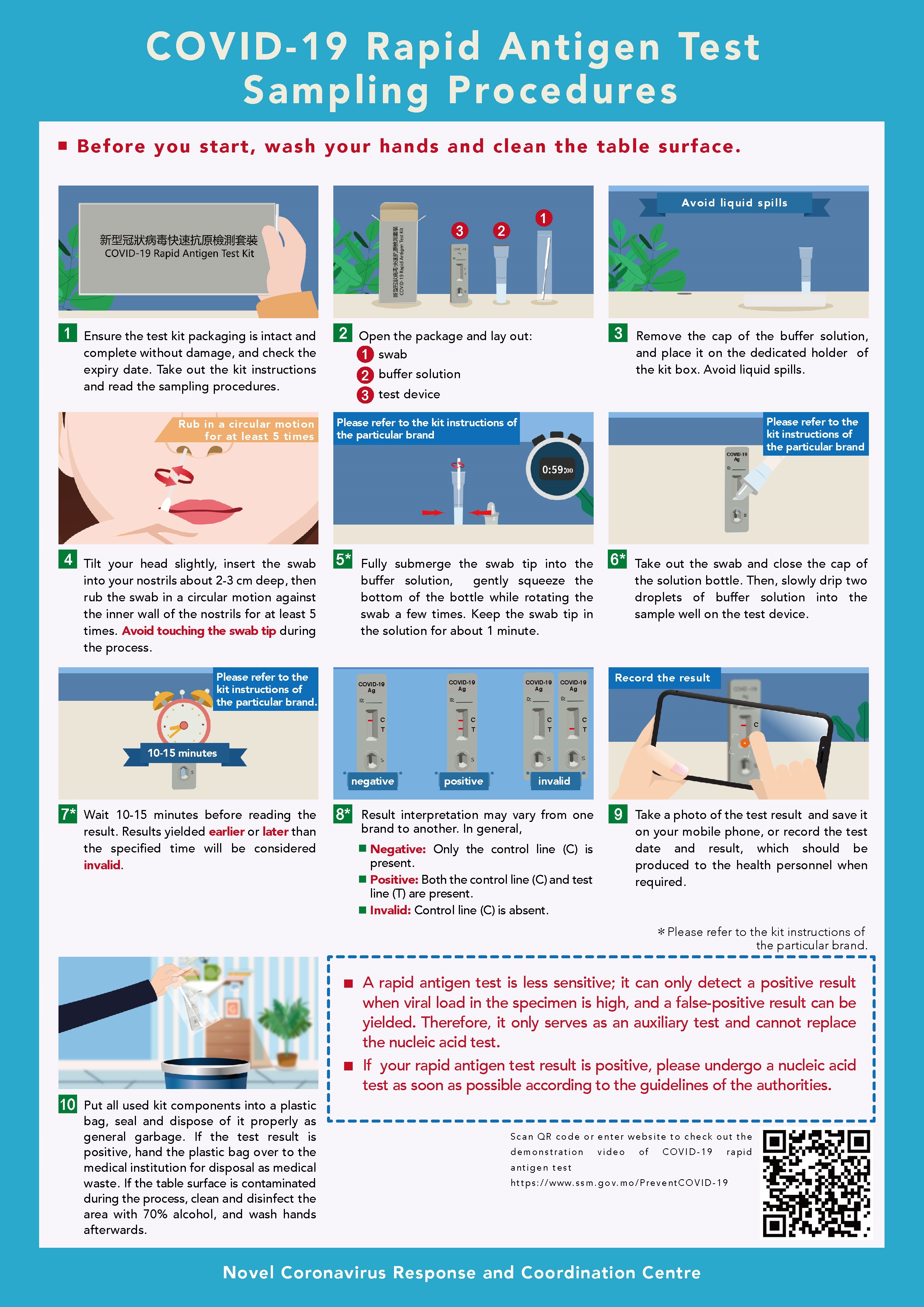 If the rapid antigen test result is positive, in addition to declaring it through Macao Health Code, one should call an ambulance by phone at 119, 120 or 2857 2222 to go to Conde de São Januário Hospital to undergo a nucleic acid test as soon as possible, regardless of whether one has a fever or respiratory symptoms. In addition, if one has a positive rapid antigen test result, he/she as well as the people living with him/ her are not allowed to go out, and a nucleic acid test will be arranged for all of them by the authorities.