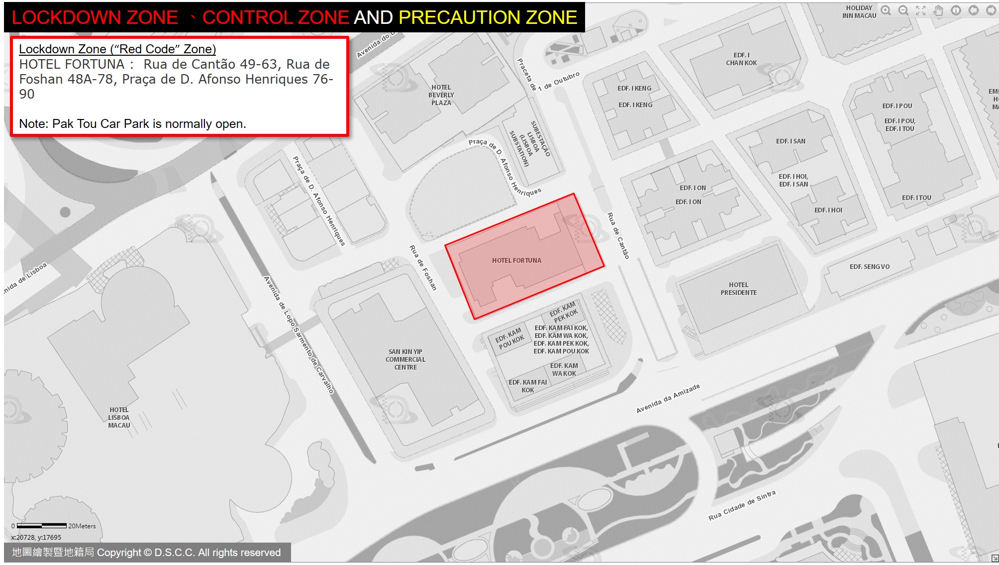 - HOTEL FORTUNA: Rua de Cantão 49-63, Rua de Foshan 48A-78, Praça de D. Afonso Henriques 76-90 ( Note: Pak Tou Car Park is normally open.);