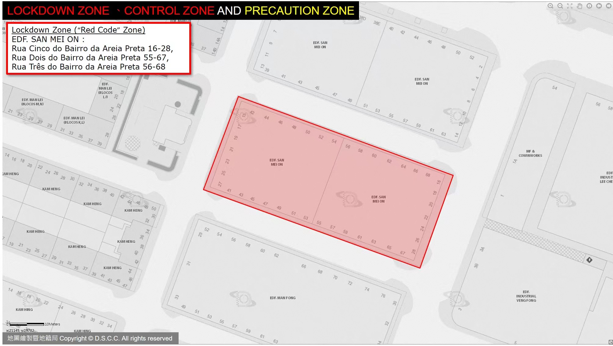 EDF. SAN MEI ON: Rua Cinco do Bairro da Areia Preta 16-28, Rua Dois do Bairro da Areia Preta 55-67, Rua Três do Bairro da Areia Preta 56-68 |