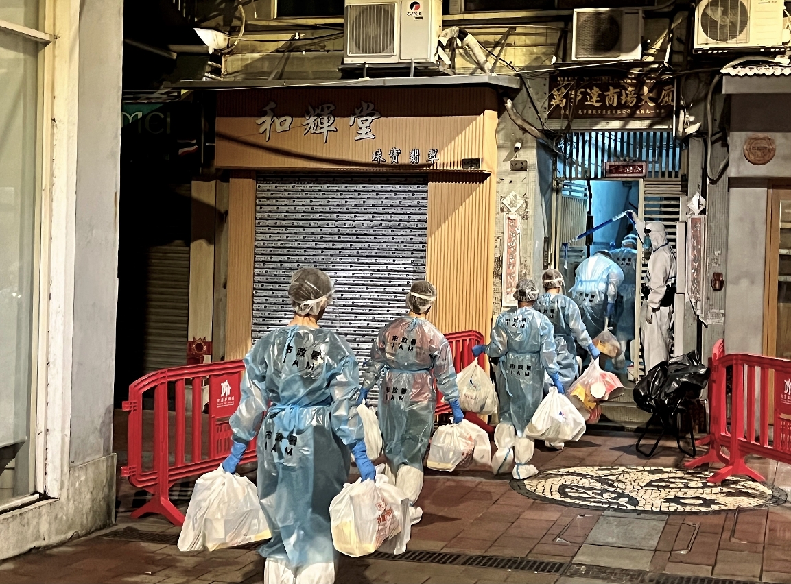 According to the latest announcement of the Novel Coronavirus Response and Coordination Centre, Centro Comercial Master (residential) located in Rua de Horta e Costa has been changed from a Yellow Code Zone to a Red Code Zone. As the severe tropical storm “Chaba” is approaching Macao, the Municipal Affairs Bureau (IAM) immediately sent personnel to carry out large-scale cleaning and disinfection work in the public areas of the building. The Subsistence Team was also immediately dispatched to gain time to complete the survey on households and distribute emergency food packs for two days to the households to serve as food reserves during the typhoon when the delivery of vegetables and frozen meat food packs or boxed meals is not possible.