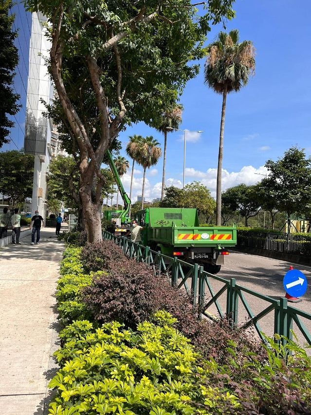 In order to reduce the impact of adverse weather on trees in the city and safeguard public safety, the tree maintenance personnel of IAM have stepped up the inspections of trees in various districts even in the epidemic control period. With regard to trees in bad health conditions and with defective structures, reinspections have been carried out while trimming and maintenance have been arranged. In addition, regular trimming has been carried out to trees with overly dense branches to reduce the weight of the tree crown and the area affected by wind, with the aim of minimising the chance of collapse of trees in strong wind and rainstorm. During the period of tree trimming, the public are advised to pay attention to the temporary traffic arrangements of the relevant road sections and not to enter the work area to avoid accidents.
