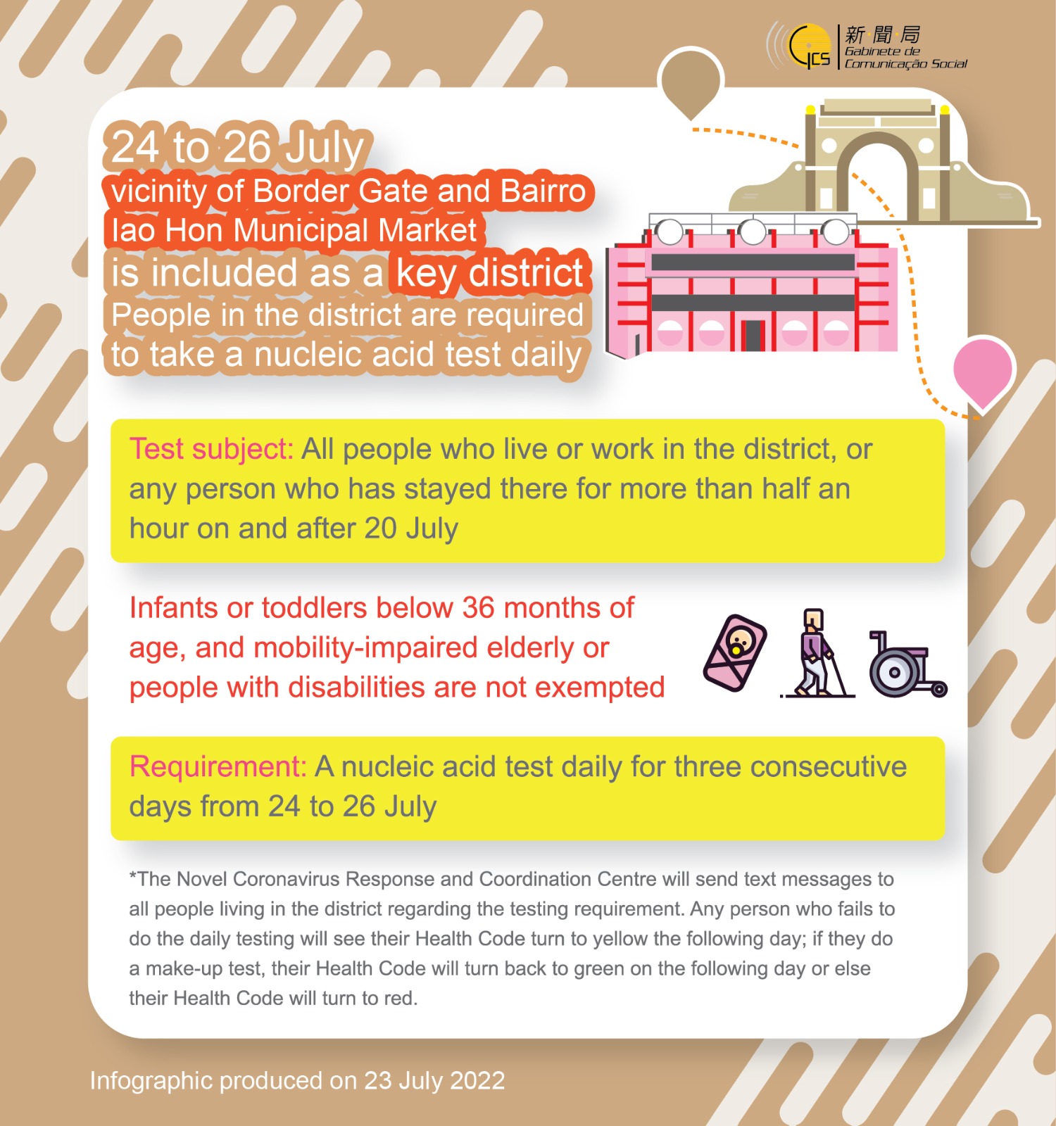 24 to 26 July vicinity of Border Gate and Bairro Iao Hon Municipal Market is included as a key district. People in the district are required to take a nucleic acid test daily