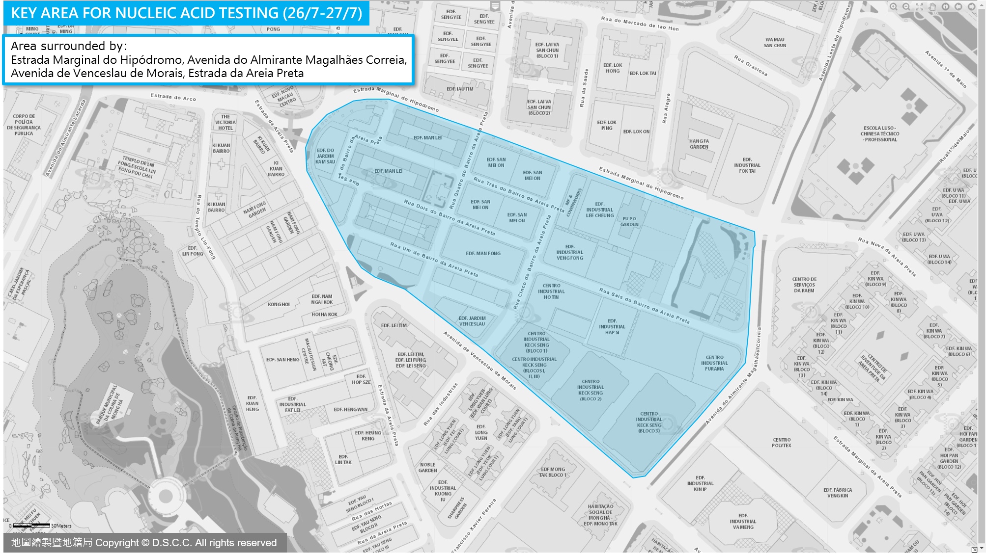 The Novel Coronavirus Response and Coordination Centre announces that, to identify and treat any potential infected persons who may still be lurking in the local community as early as possible, people in the following key areas are subject to a nucleic acid test on either 26 July (Tuesday) or 27 July (Wednesday).