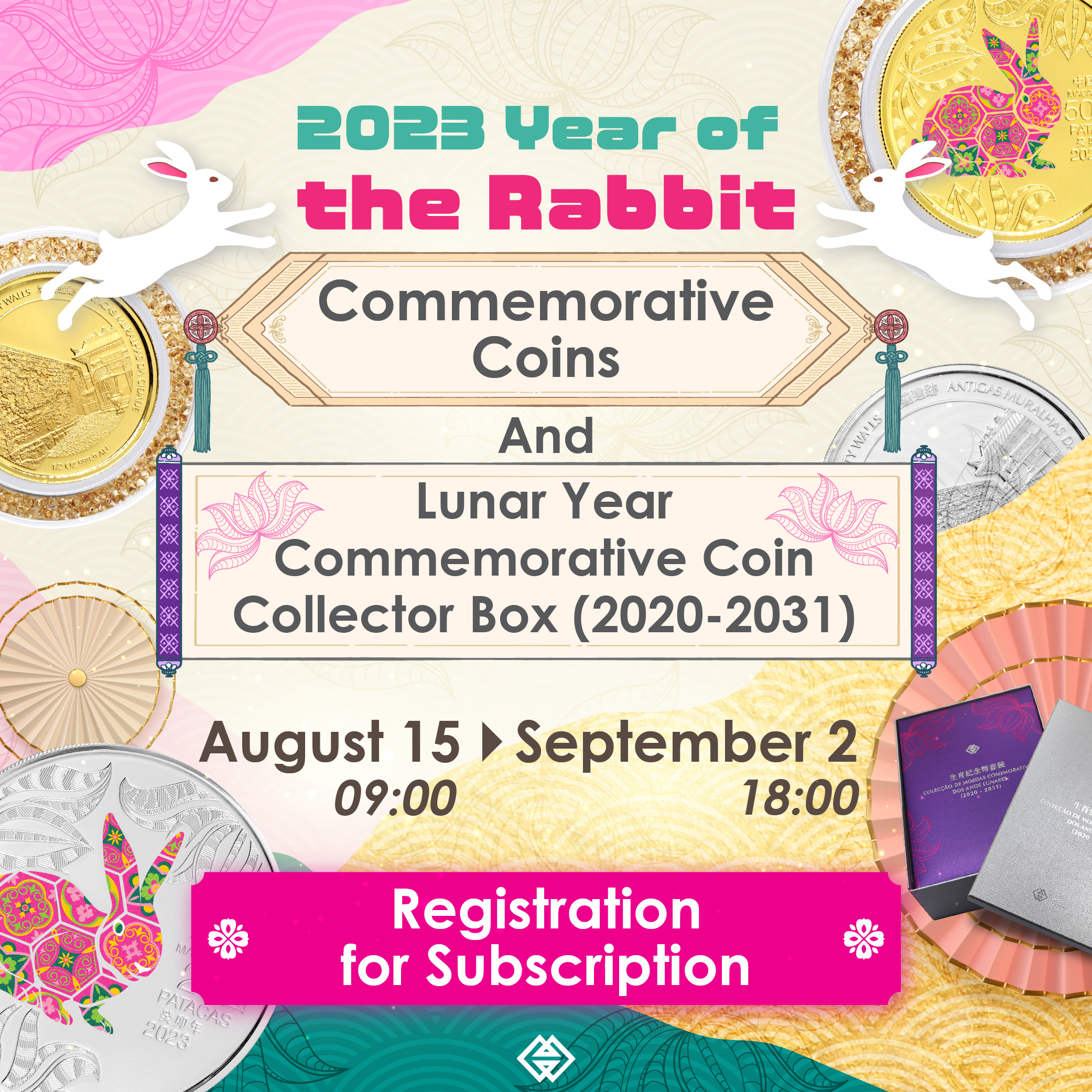 Holders of Macao SAR resident identity card, and who are aged 18 or above, can register online for subscription of the said coins and collector box via AMCM webpage ( https://www.amcm.gov.mo/static/COCSCollection_2022/terms_pt.html ) from 9:00am on 15 August 2022 until 6:00pm on 2 September 2022. During the mentioned period, a service counter will be set up at the lobby of AMCM to provide registration service for those who require assistance.