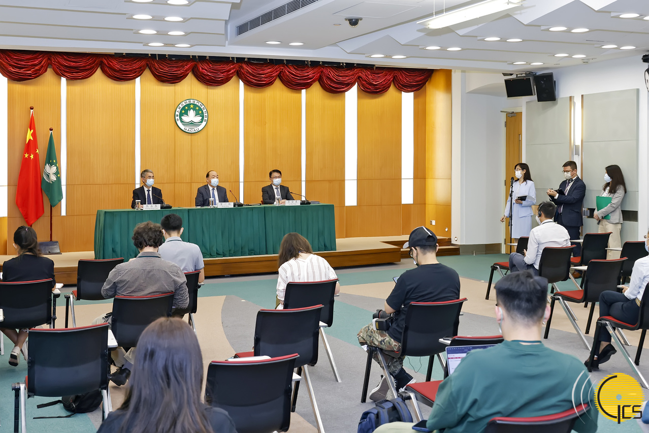• The Chief Executive, Mr Ho Iat Seng, holds a press conference at the Government Headquarters, with the Secretary for Administration and Justice, Mr Cheong Weng Chon, and the Secretary for Economy and Finance, Mr Lei Wai Nong, in attendance.